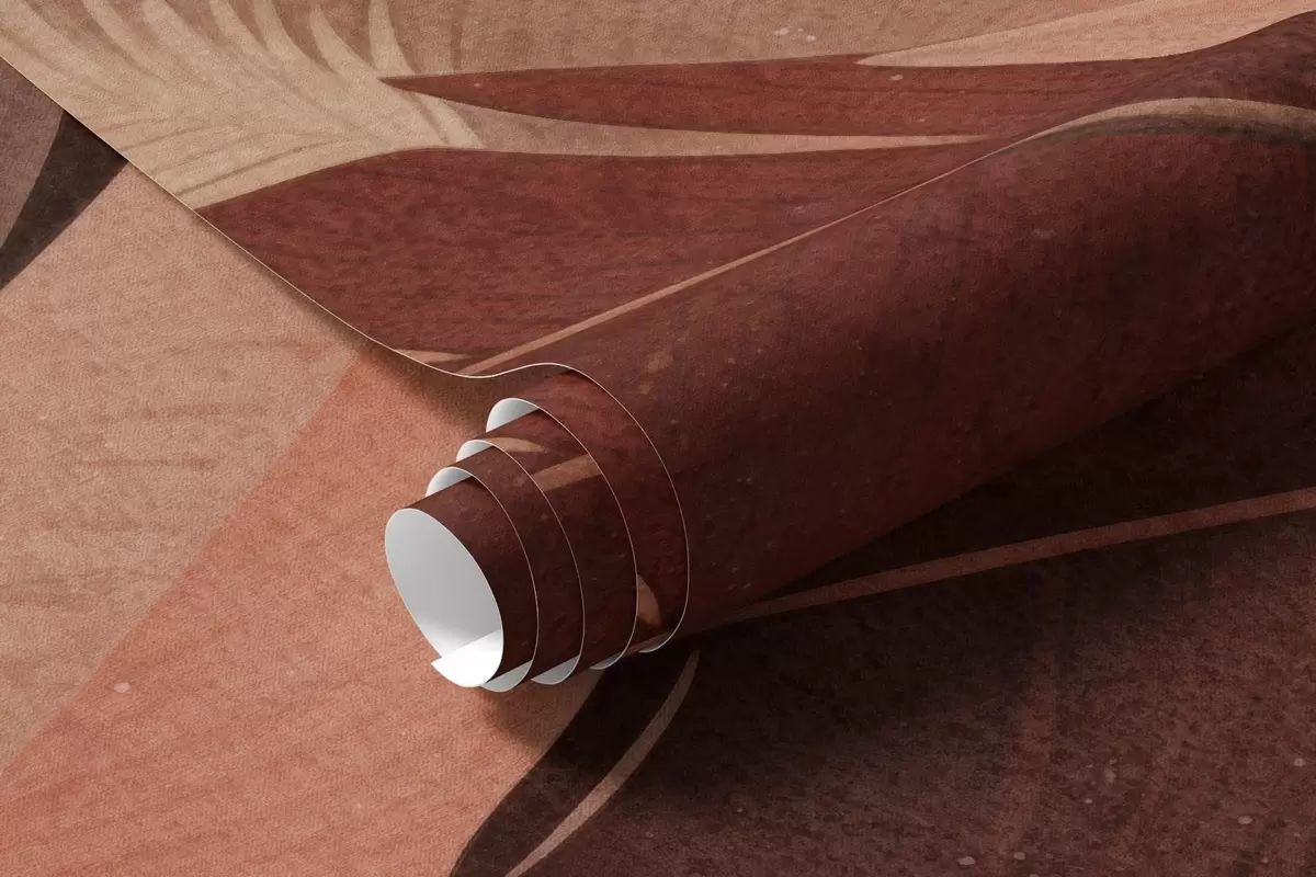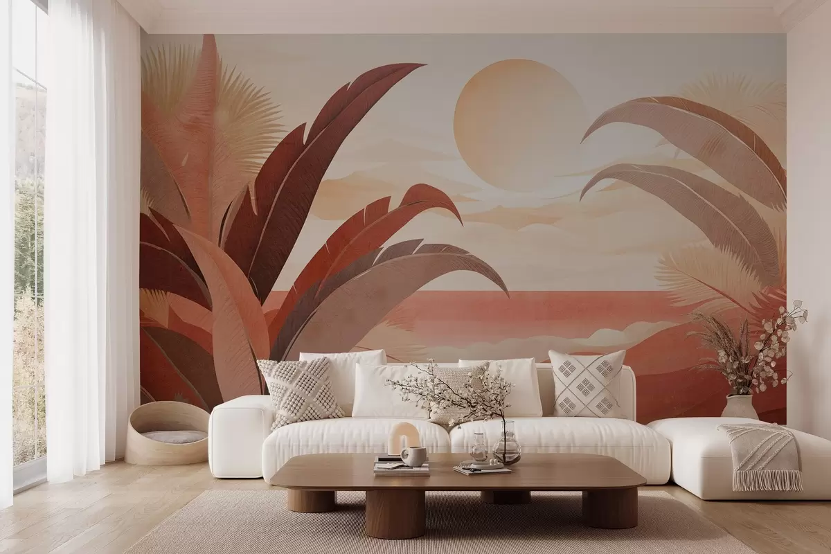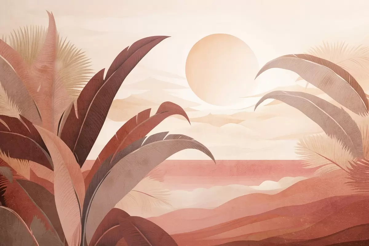 Fototapet Tropiskt texturerat abstrakt landskap med palmblad och en stor sol på himlen, varm färgpalett, minimalistisk stil, stiliserad Nr. w09296