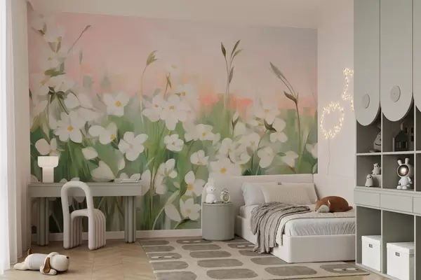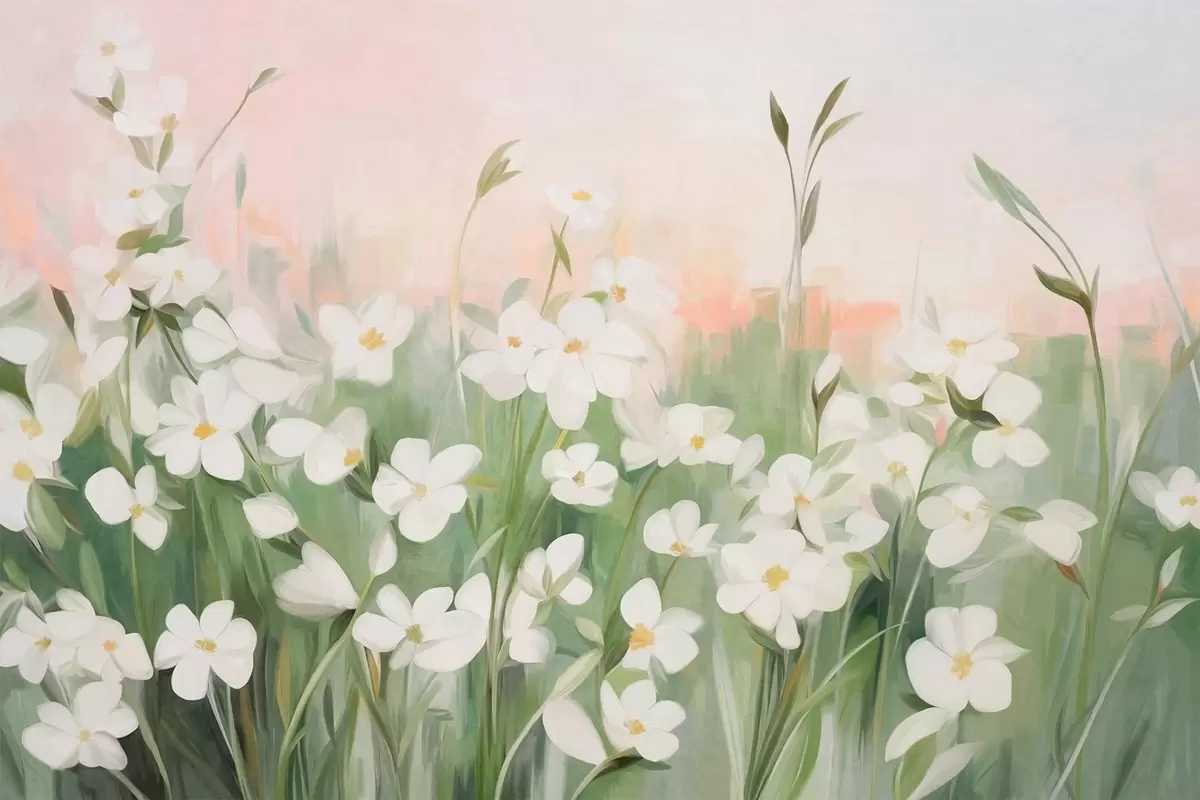 Fototapet Abstrakt motiv av vildblommor med gröna stjälkar och blad mot en mjuk rosa och vit texturerad himmel. Nr. w09297