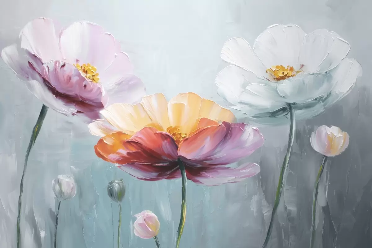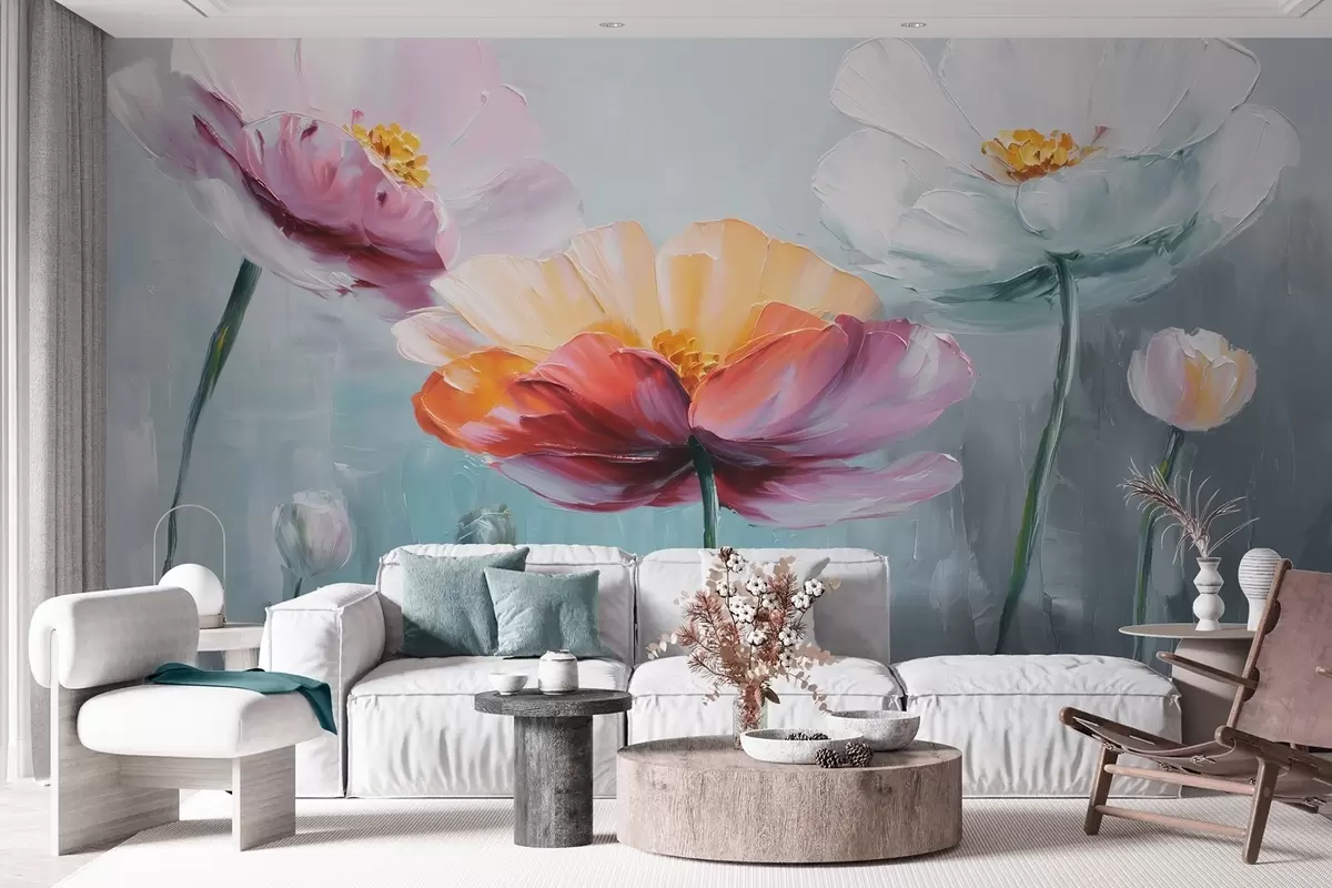 Fototapet Ljusa blommor i oljemålningsteknik på en blå bakgrund Nr. w09310