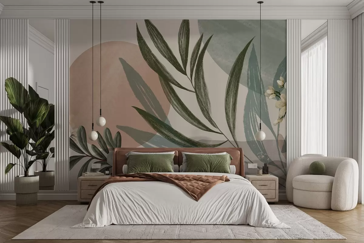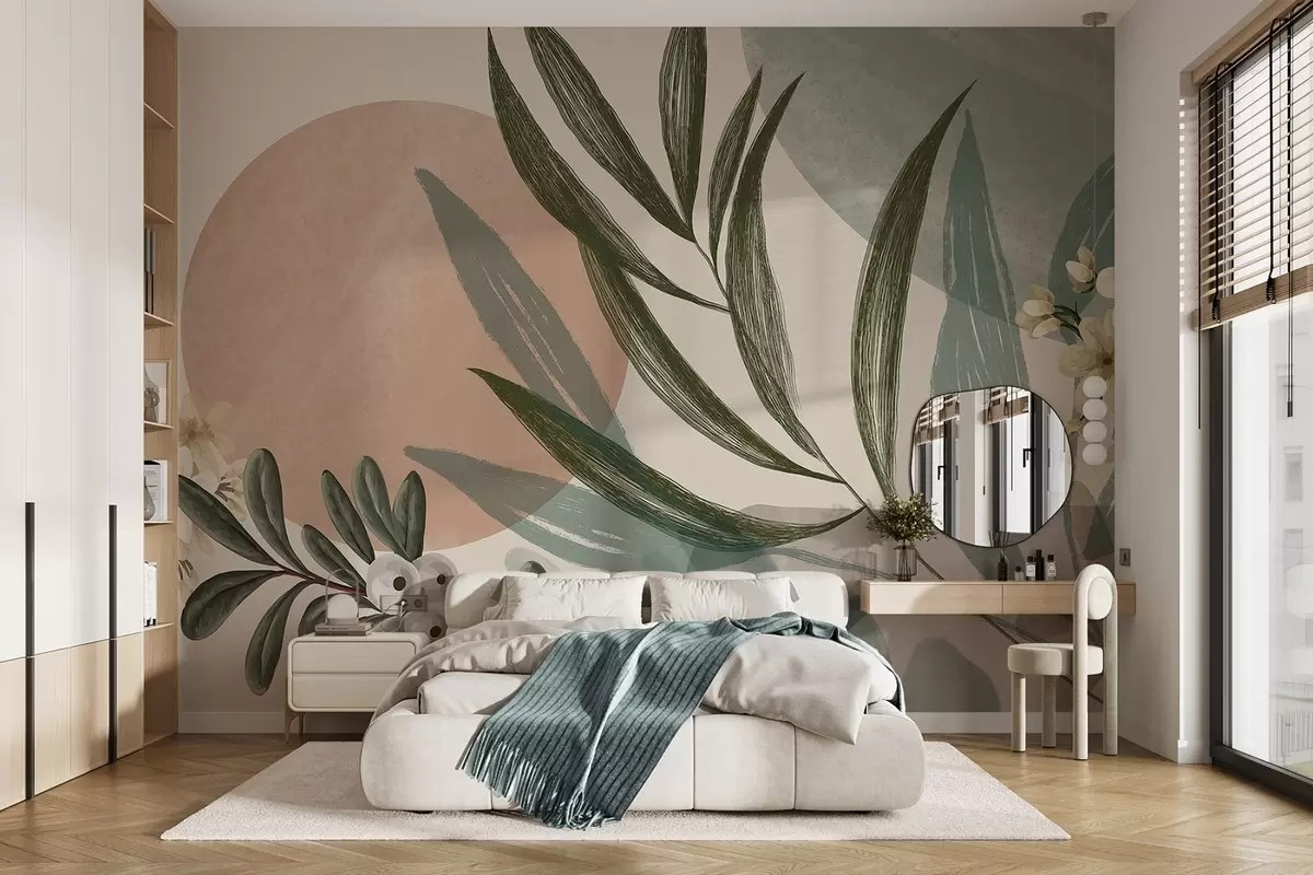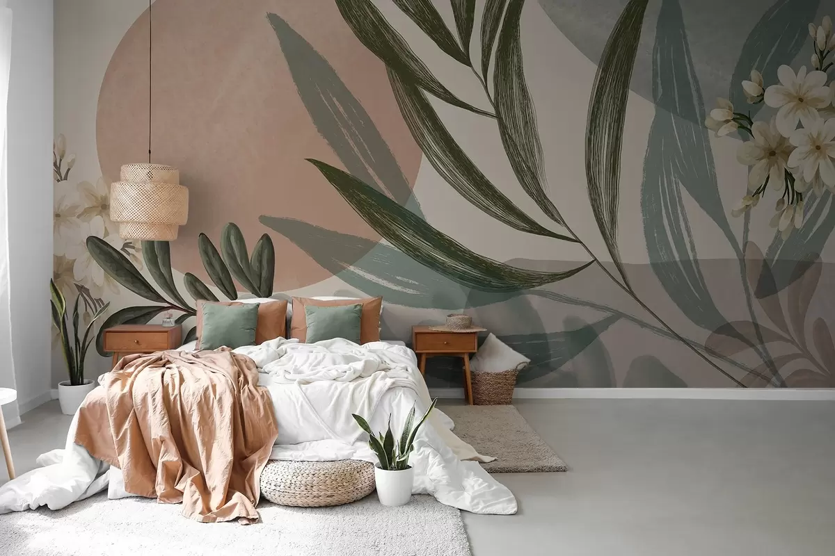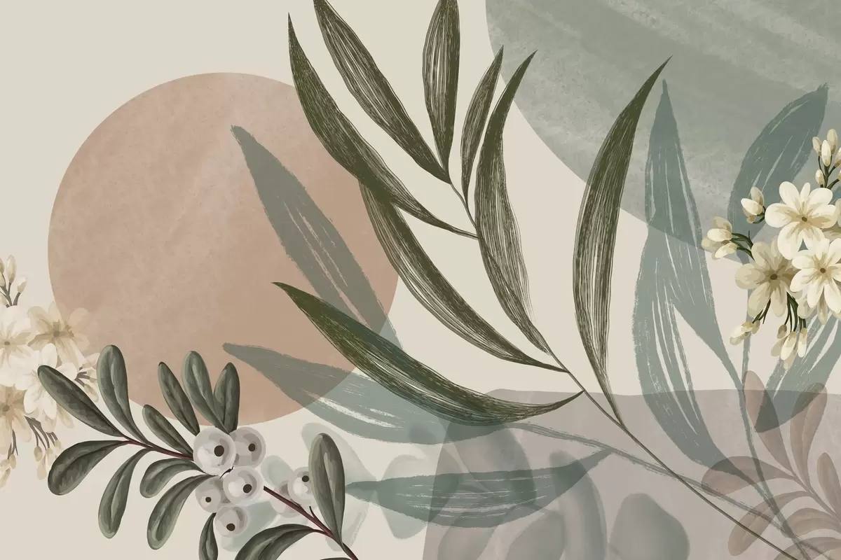 Fototapet Abstrakt botanisk konst med gröna palmblad och vita bär, mot en bakgrund av former i dämpade jordtoner Nr. w09312