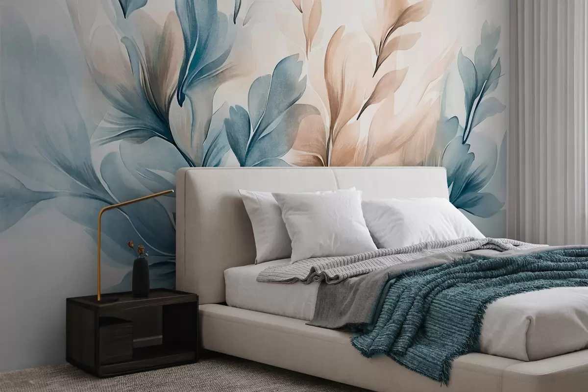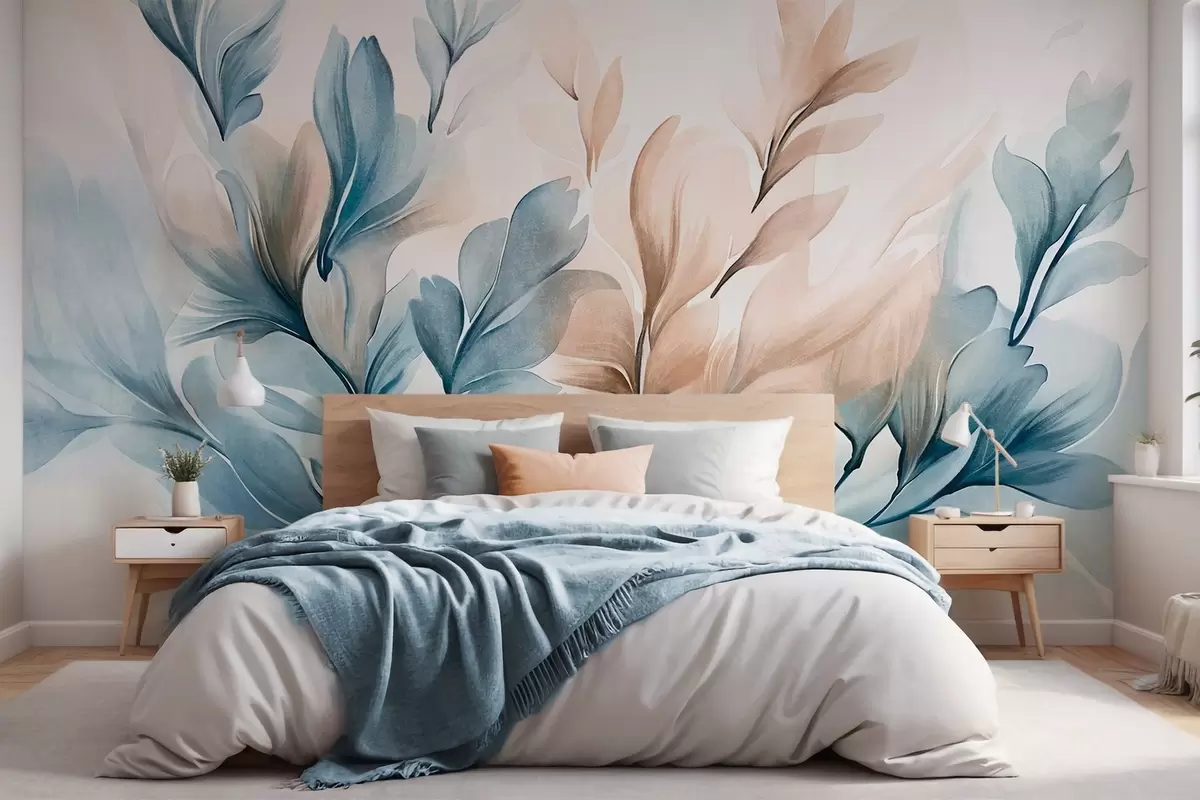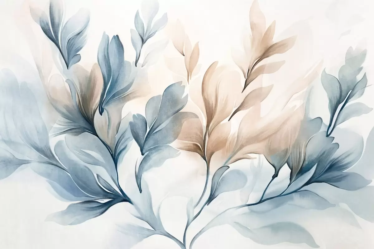 Fototapet Blå och bruna abstrakta blad med synliga penseldrag, ljus och strukturerad, mjuk färgpalett, akvarelleffekt Nr. w09313
