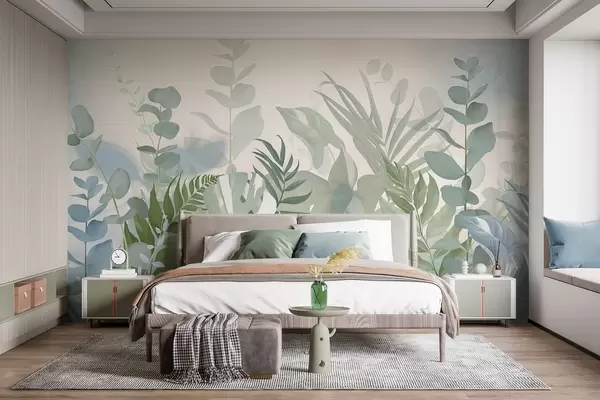 Fototapet Pastellgröna växter ormbunkar, monstera och eukalyptus, ljus texturerad bakgrund, mjuk belysning, fridfull , botanisk illustration Nr. w09316