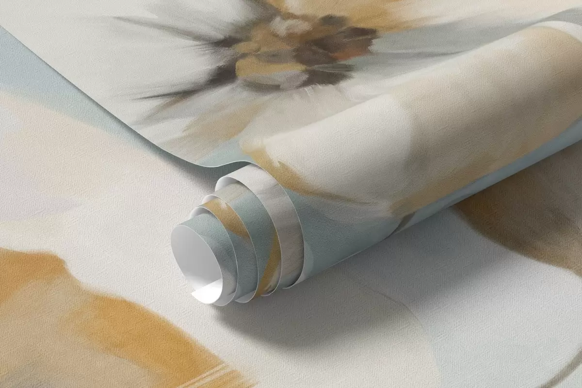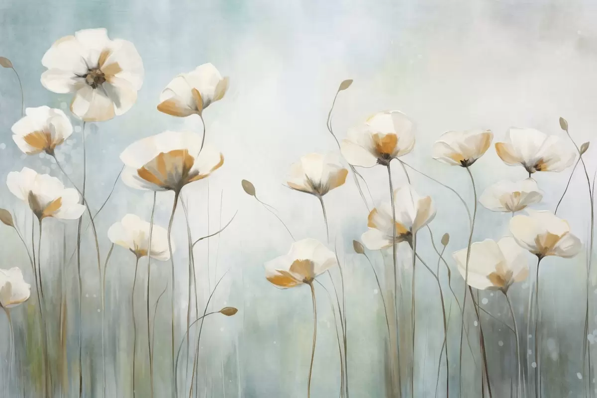 Fototapet Vita texturerade vallmor på långa stjälkar, ljusblå och grön bakgrund, mjuka penseldrag, delikat blomsterarrangemang Nr. w09317