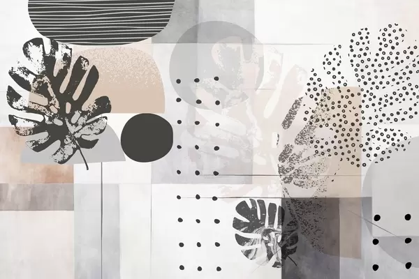 Fototapet Abstrakt tryck med geometriska former och tropiska blad från monstera, cirklar, prickar och linjer, modern och minimalistisk design Nr. w09333