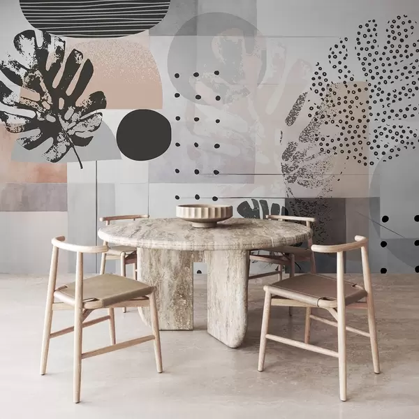 Fototapet Abstrakt tryck med geometriska former och tropiska blad från monstera, cirklar, prickar och linjer, modern och minimalistisk design Nr. w09333