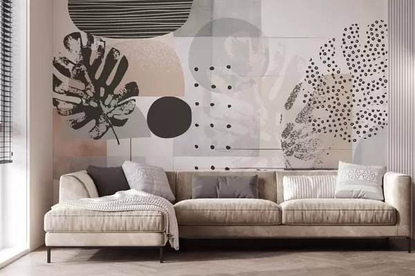 Fototapet Abstrakt tryck med geometriska former och tropiska blad från monstera, cirklar, prickar och linjer, modern och minimalistisk design Nr. w09333