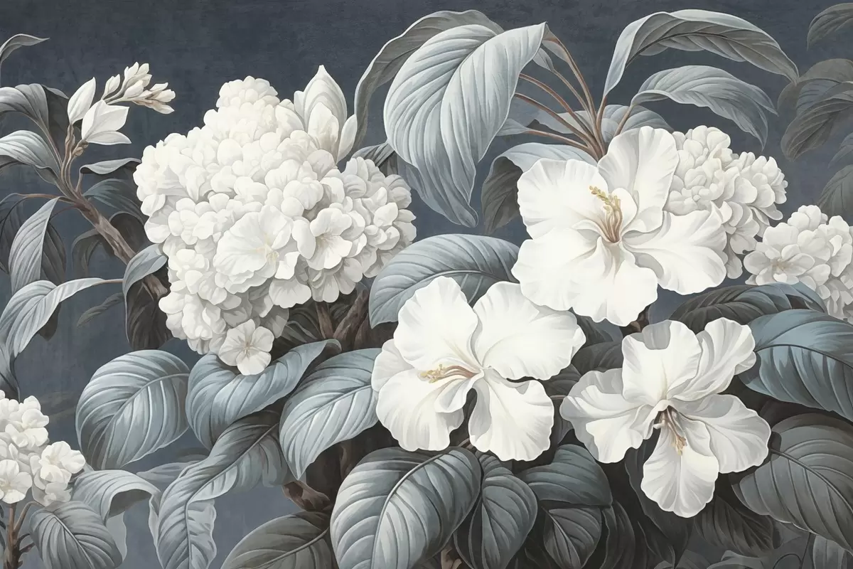Fototapet Vita tropiska blommor med skira kronblad och blad mot en mörkblå bakgrund, vintage texturerad stil, botanisk illustration Nr. w09334