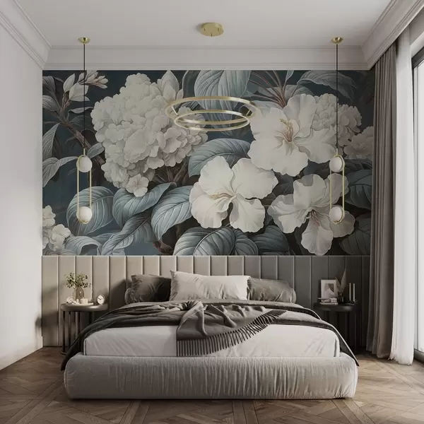 Fototapet Vita tropiska blommor med skira kronblad och blad mot en mörkblå bakgrund, vintage texturerad stil, botanisk illustration Nr. w09334