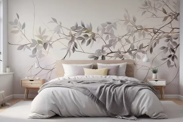 Fototapet Delikata grenar med dämpade grå, lila och gröna blad mot en mjuk, suddig bakgrund. Nr. w09336
