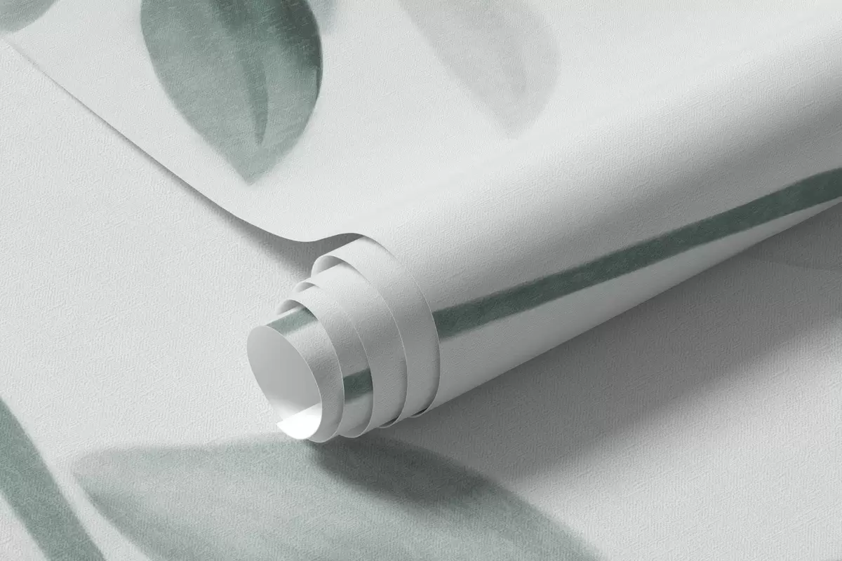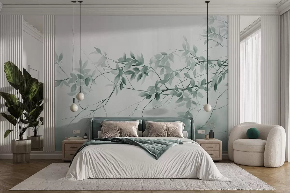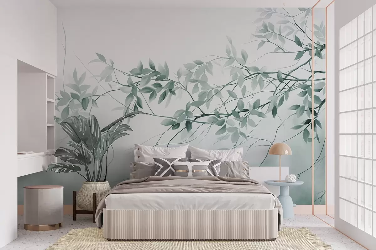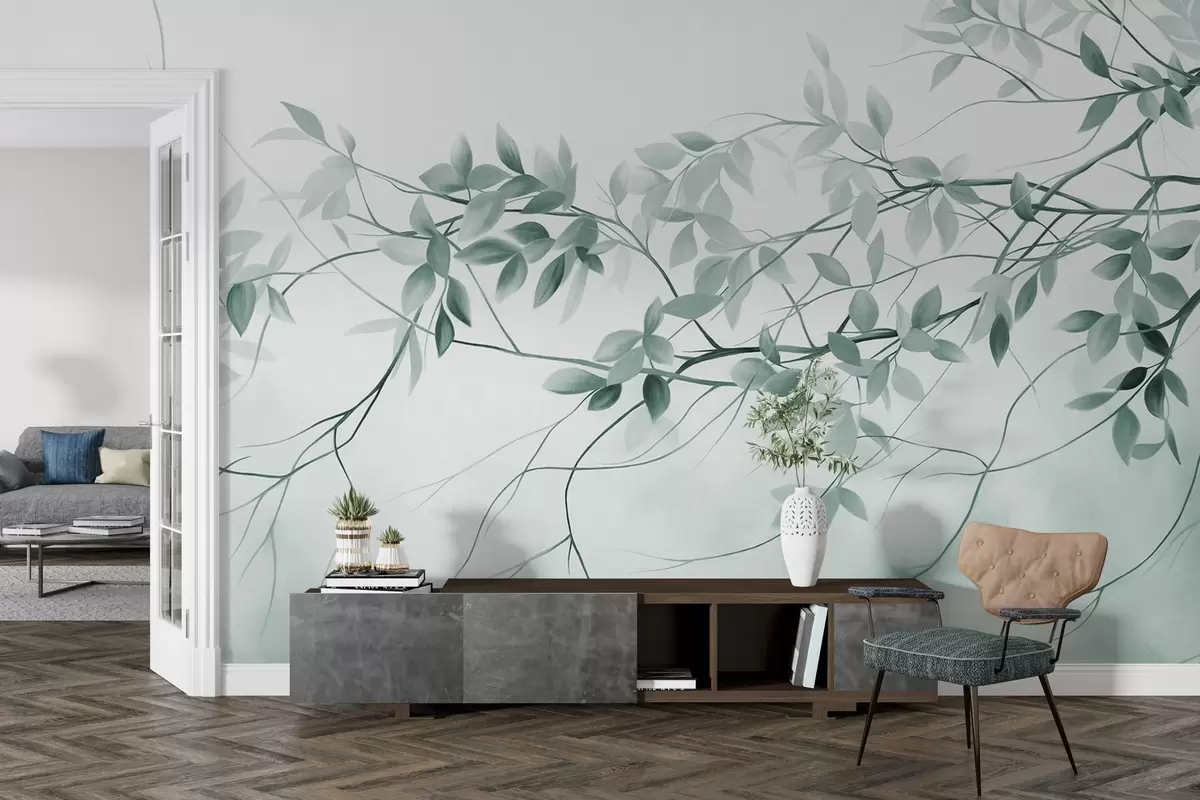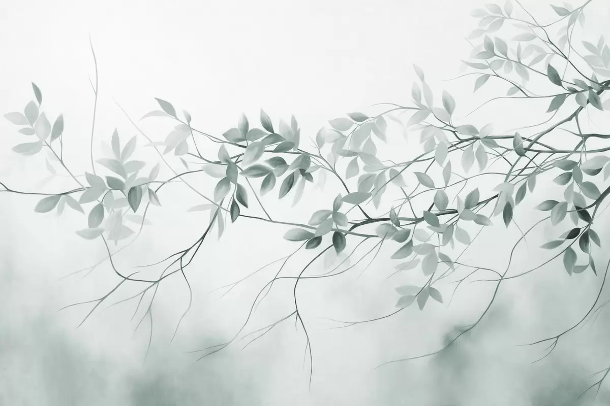 Fototapet Delikata grenar med dämpade grå och gröna blad mot en mjuk, suddig bakgrund Nr. w09336v1