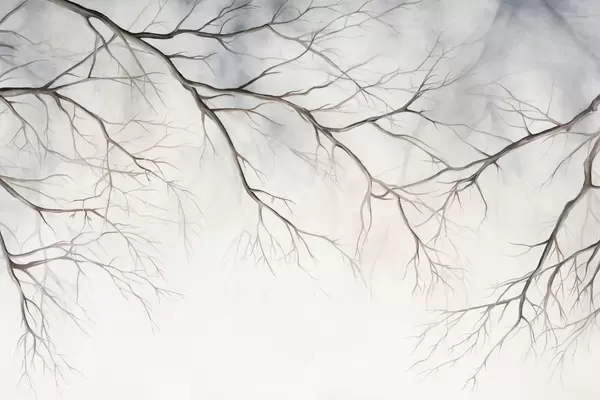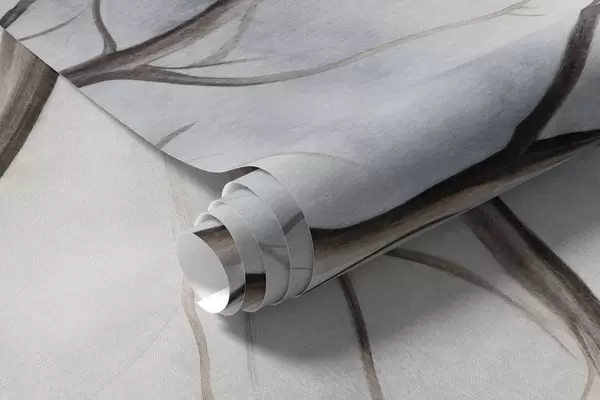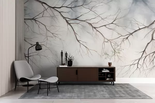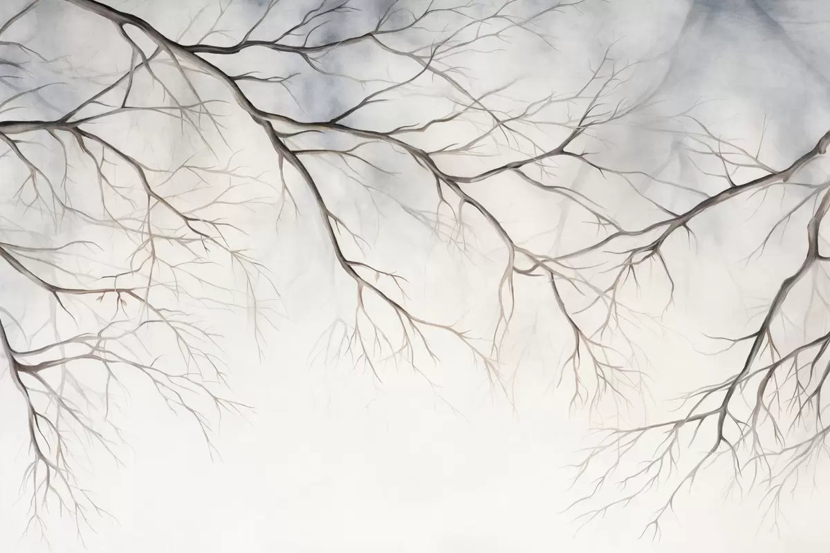 Fototapet Trädgrenar med texturerad akvarelleffekt, invecklade detaljer, mjuk färgpalett, mot en ljus bakgrund Nr. w09337