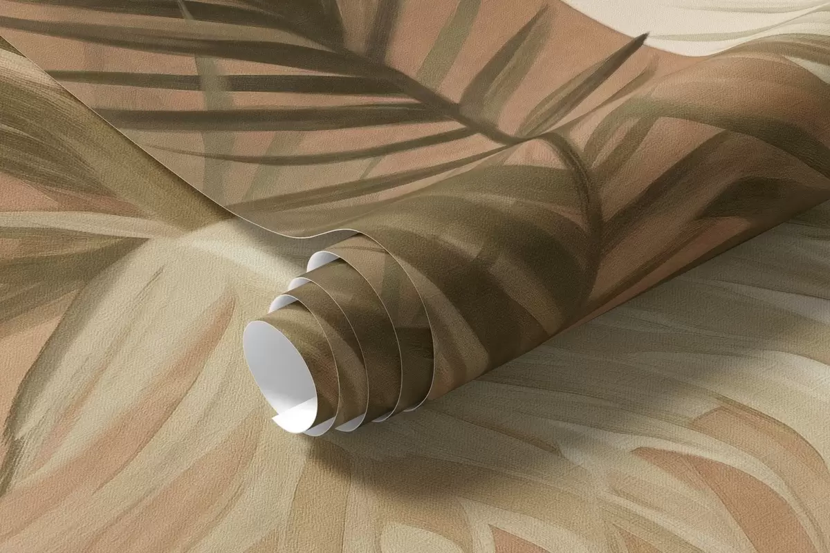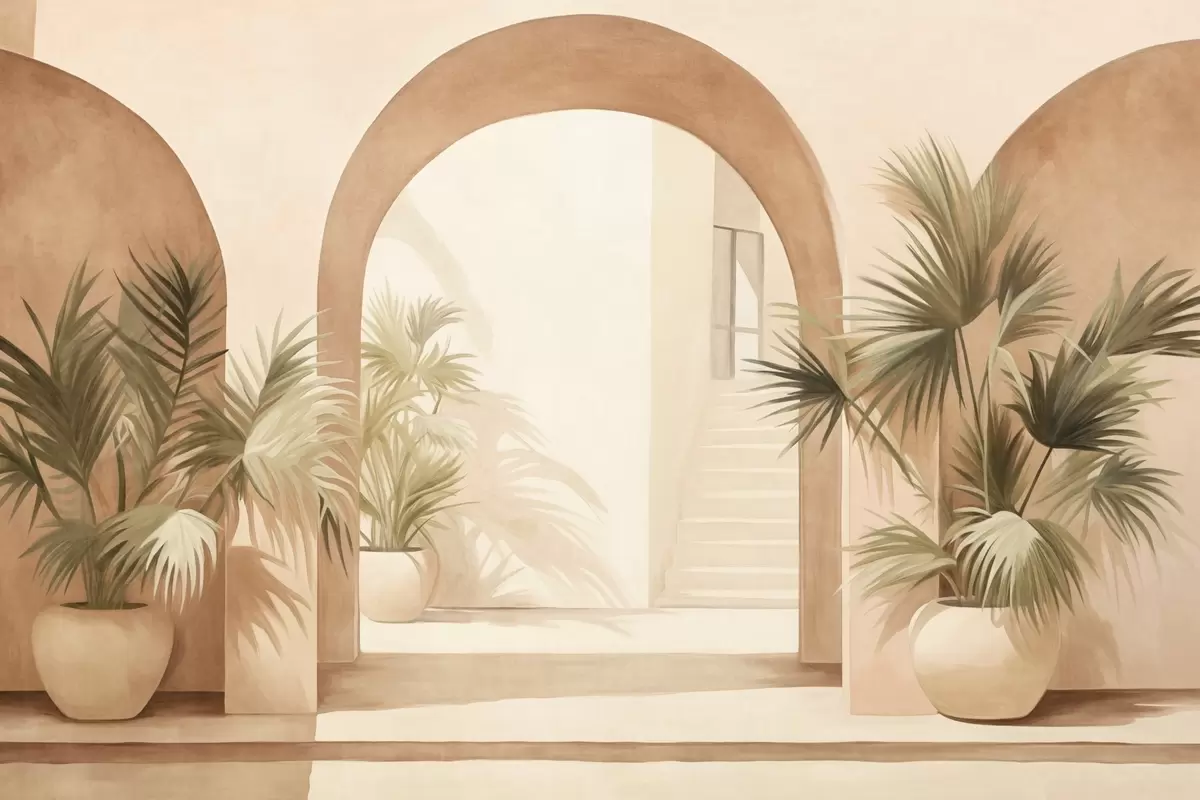 Fototapet Strukturerade valv med krukväxter, ljusbeige färgpalett, minimalistisk design, trappa i bakgrunden Nr. w09339