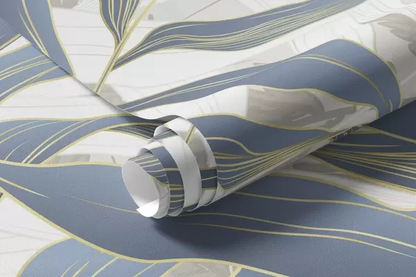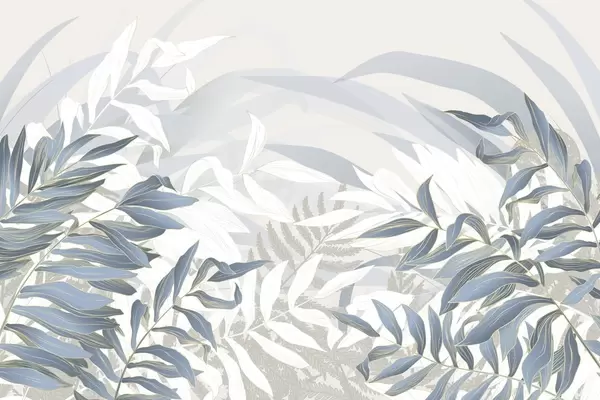 Fototapet Blå och vita blad och gräs, mjuka pastellfärger, botanisk illustration, minimalistisk design, dekorativ, modern Nr. w09341
