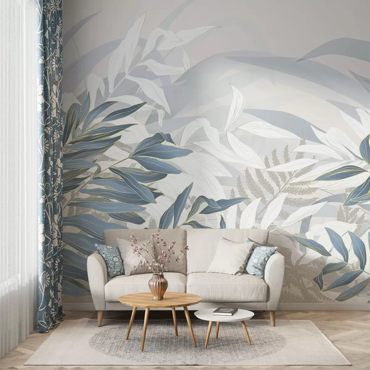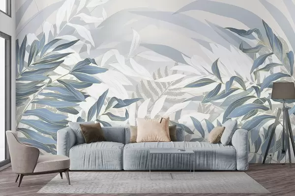 Fototapet Blå och vita blad och gräs, mjuka pastellfärger, botanisk illustration, minimalistisk design, dekorativ, modern Nr. w09341