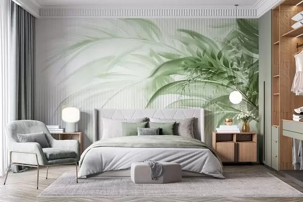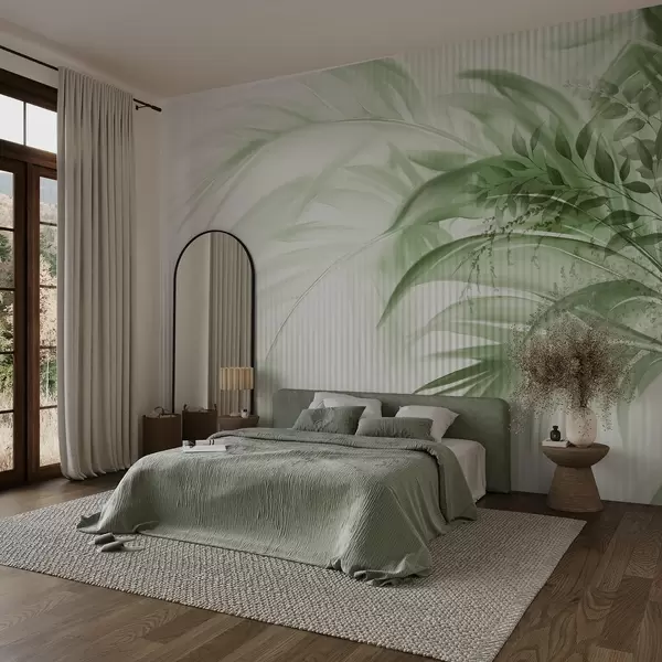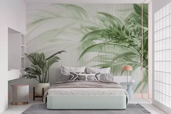 Fototapet Palm tropiska gröna blad med vit randig bakgrund, mjuk belysning, fina penseldrag, organiska former Nr. w09343