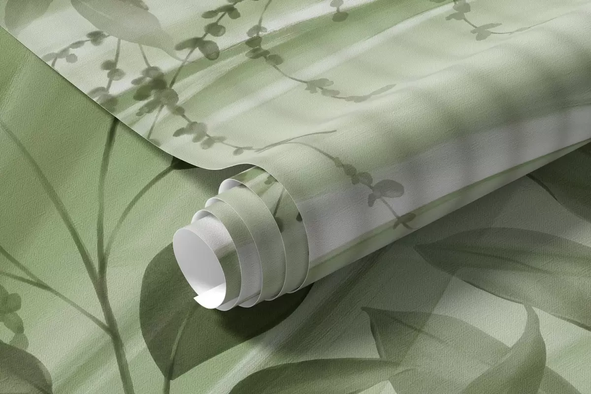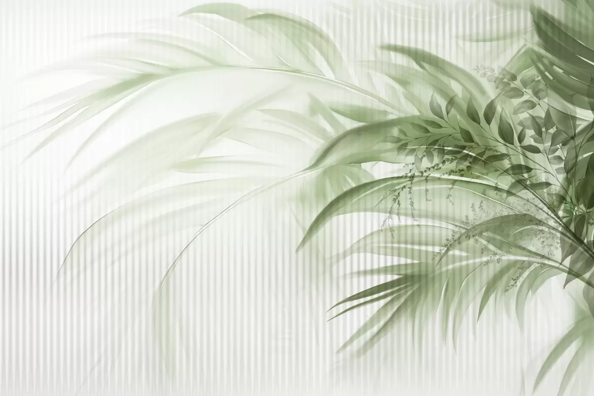 Fototapet Palm tropiska gröna blad med vit randig bakgrund, mjuk belysning, fina penseldrag, organiska former Nr. w09343