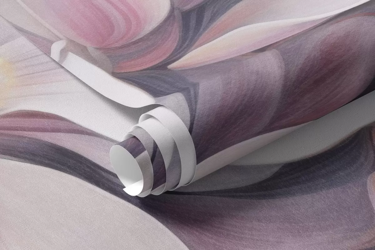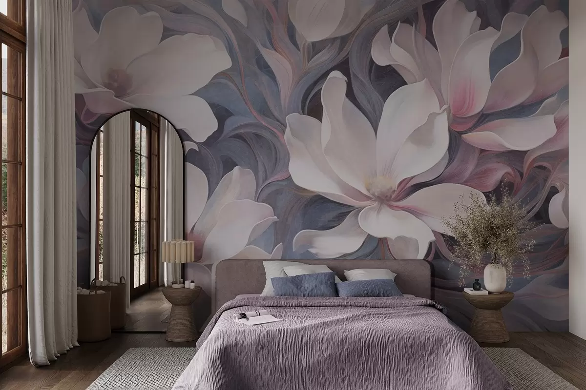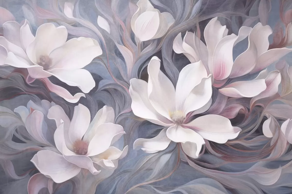 Fototapet Texturerad målning av vita magnoliablommor med rosa accenter, mot en bakgrund av virvlande, dämpade blå och grå toner Nr. w09344