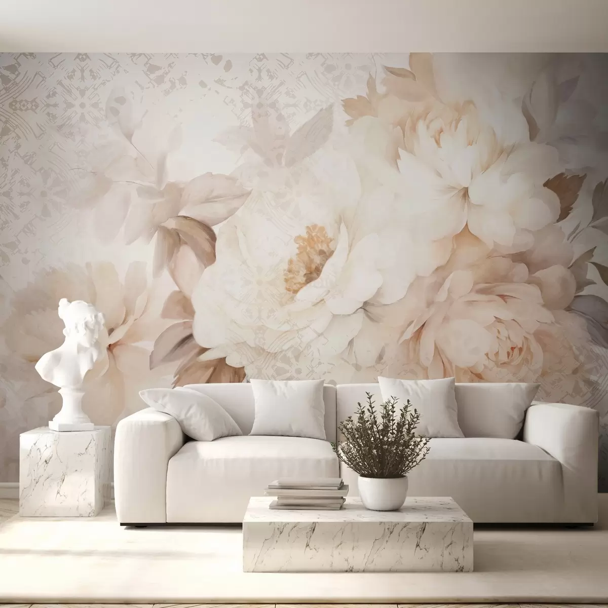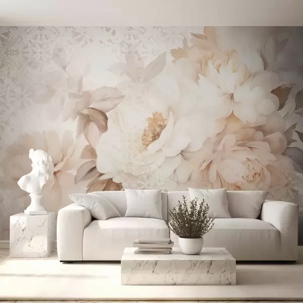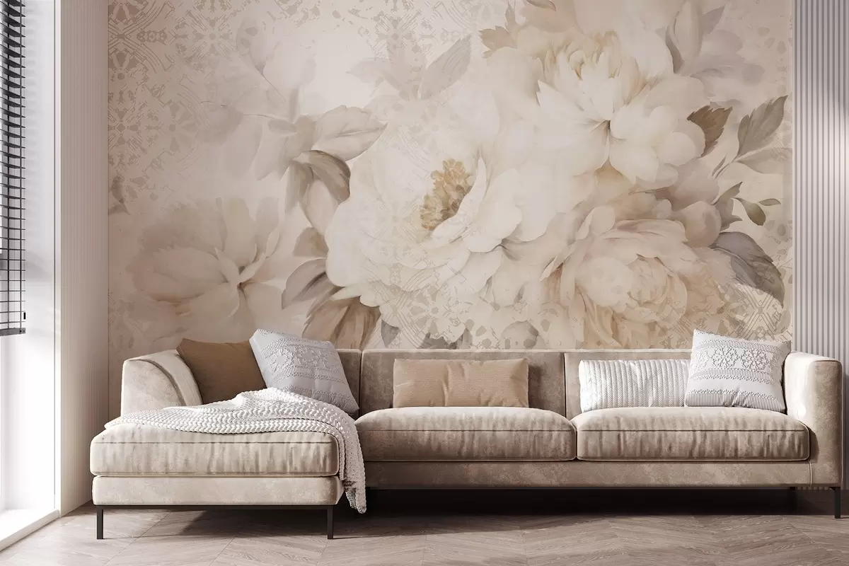 Fototapet Ett blomsterarrangemang av vita pioner med beige blad, mot en dekorativ bakgrund med vintagetextur Nr. w09345