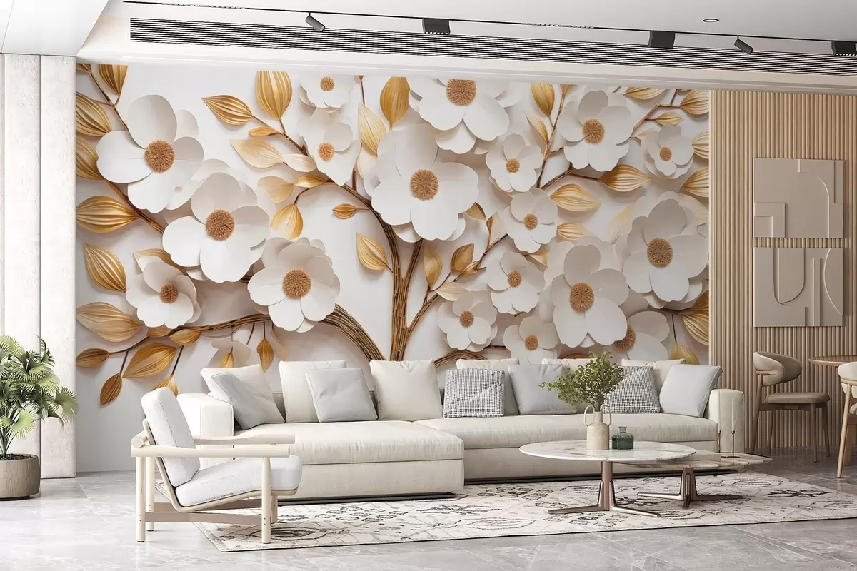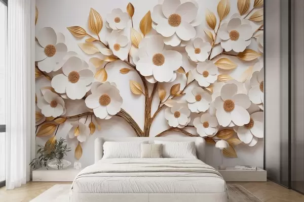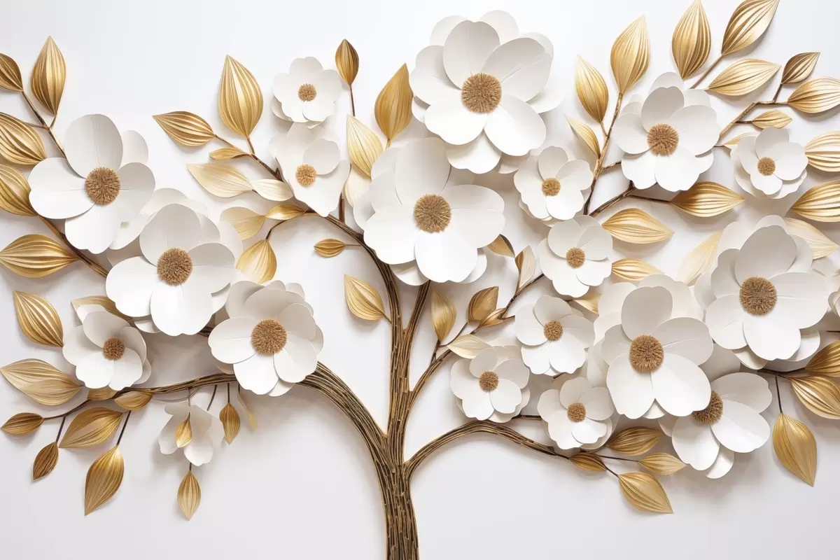 Fototapet Träd med vita blommor och imitation av reliefblad Nr. w09348