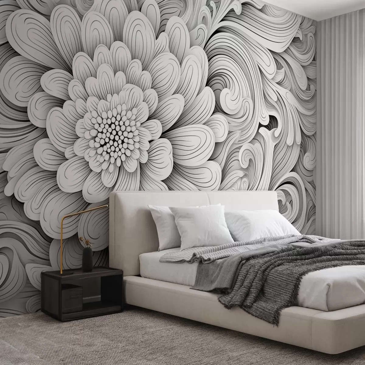 Fototapet Dekorativt svartvitt mönster i form av en blomma och virvlar Nr. w09355
