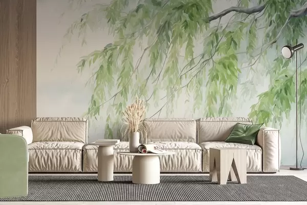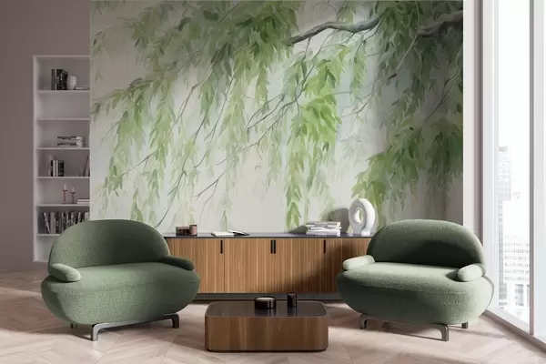 Fototapet Grenar av gråvide med gröna blad som hänger ner, mjuka och känsliga penseldrag, akvarellmålningsstil Nr. w09365