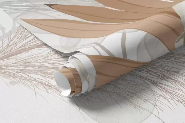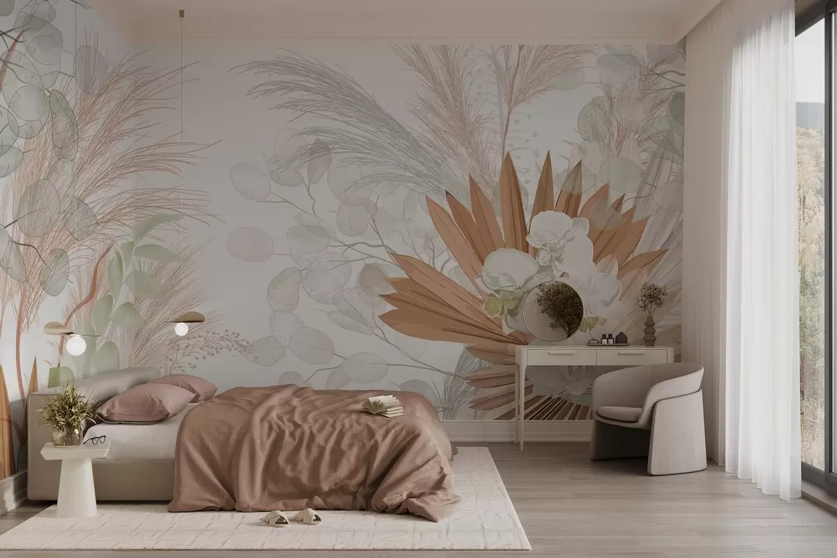Fototapet Pampasgräs, eukalyptus, tropiska blad och orkidéer på vit bakgrund, pastellfärger Nr. w09366
