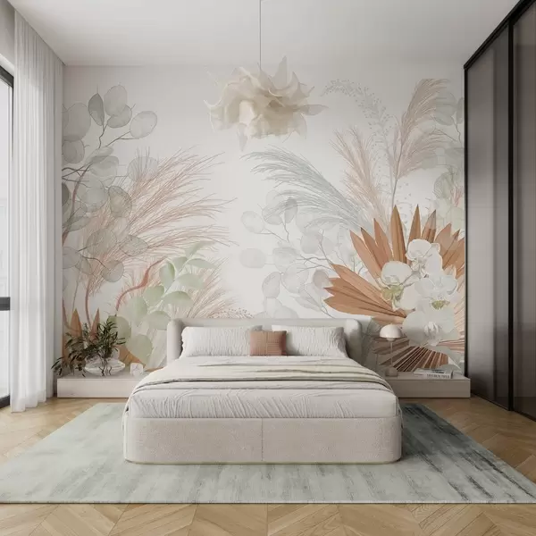 Fototapet Pampasgräs, eukalyptus, tropiska blad och orkidéer på vit bakgrund, pastellfärger Nr. w09366