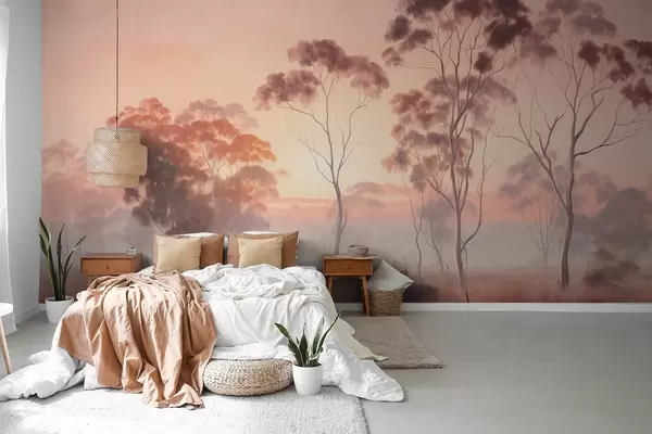 Fototapet Ett landskap med eukalyptusträd på ett fält med pastellrosa och orange himmel, en lätt dimma, målning i texturerad stil Nr. w09367