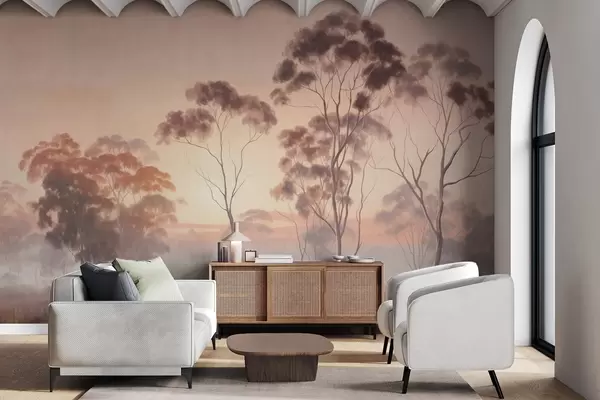Fototapet Ett landskap med eukalyptusträd på ett fält med pastellrosa och orange himmel, en lätt dimma, målning i texturerad stil Nr. w09367