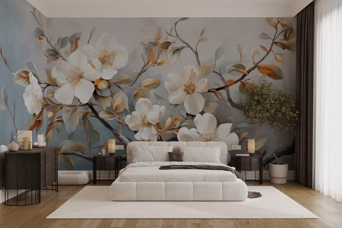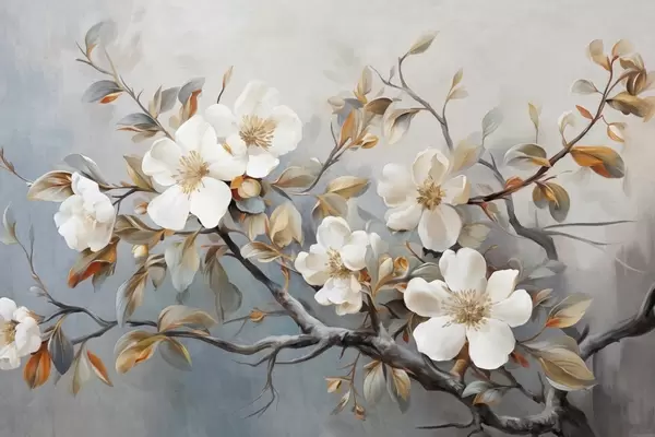 Fototapet Vita blommor med gula pistiller på en trädgren med blad, ljus bakgrund, vintage målningsstil, texturerat tryck Nr. w09368