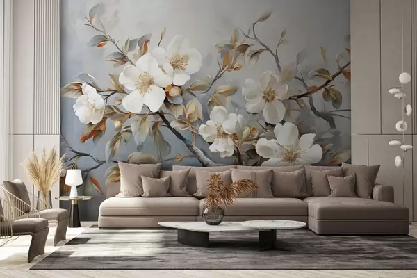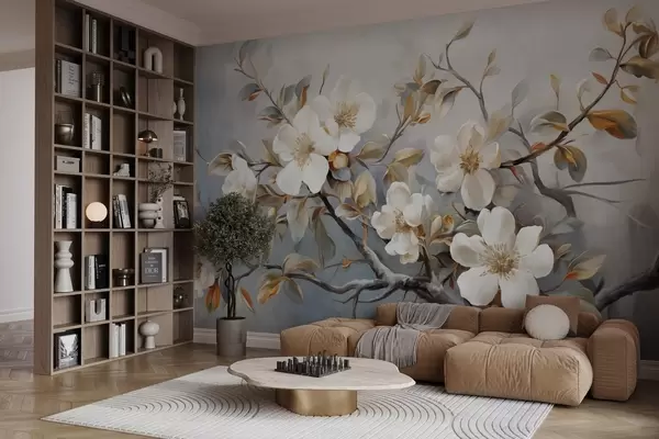 Fototapet Vita blommor med gula pistiller på en trädgren med blad, ljus bakgrund, vintage målningsstil, texturerat tryck Nr. w09368