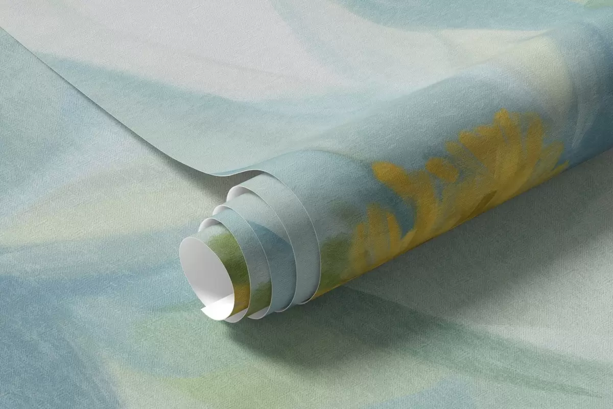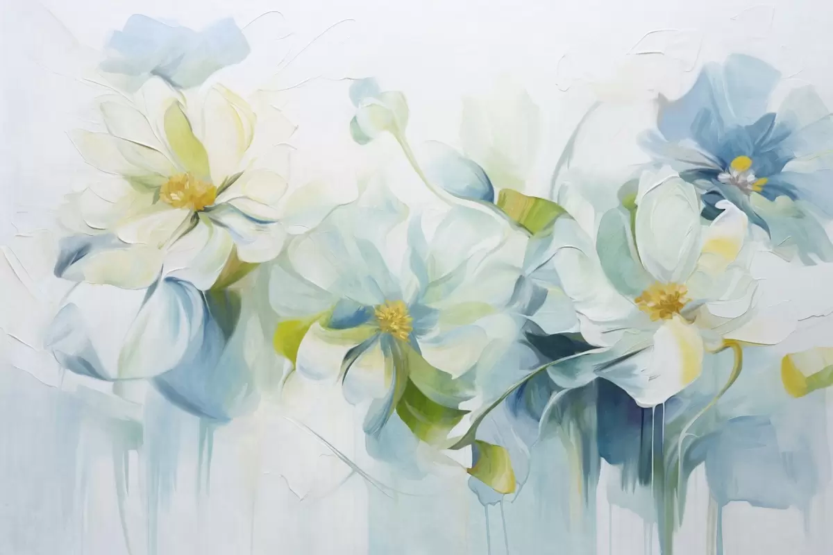 Fototapet Abstrakta vita och blå blommor med gula pistiller och gröna blad, i en vit bakgrund, texturerad målningsstil Nr. w09372