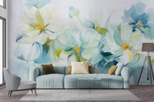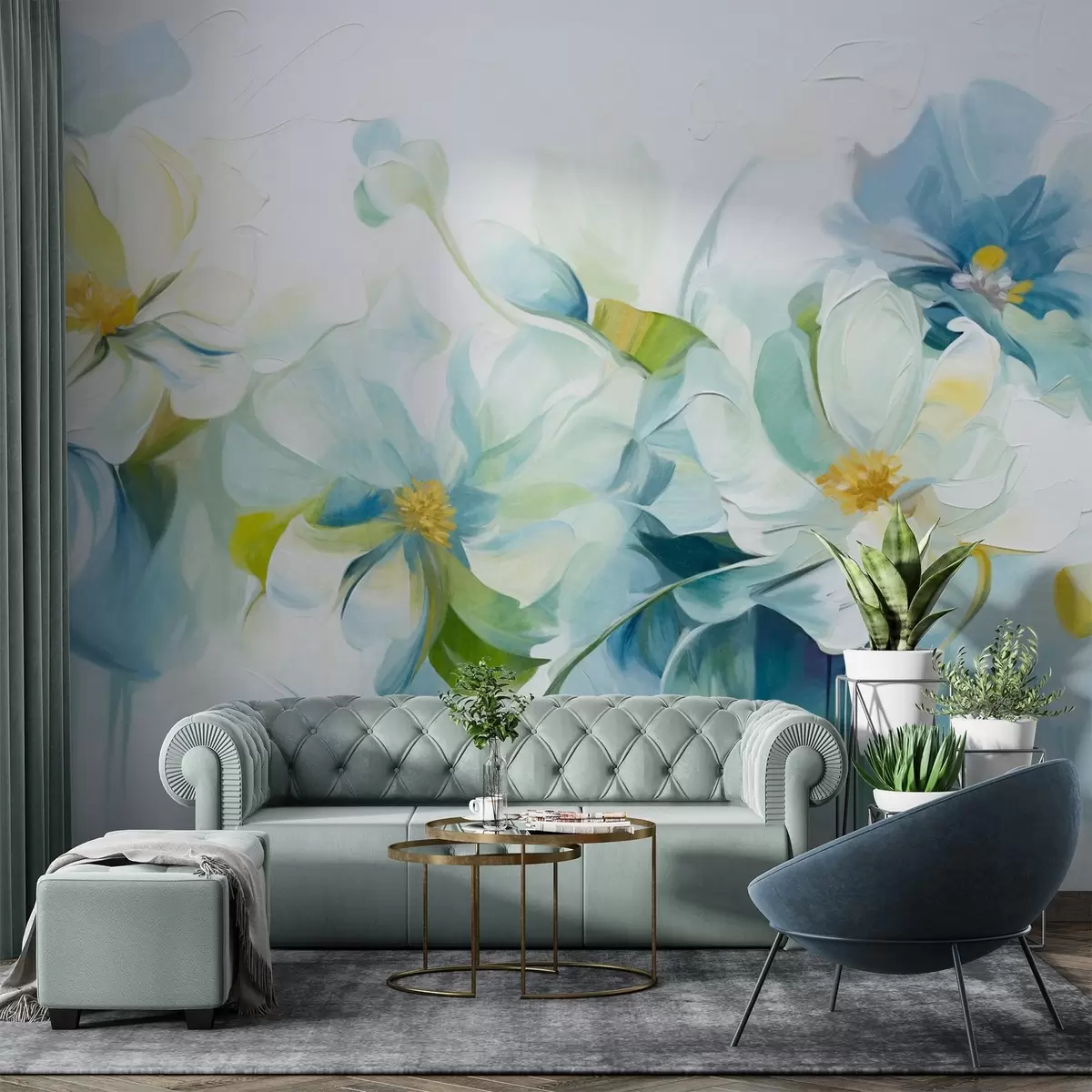 Fototapet Abstrakta vita och blå blommor med gula pistiller och gröna blad, i en vit bakgrund, texturerad målningsstil w09372
