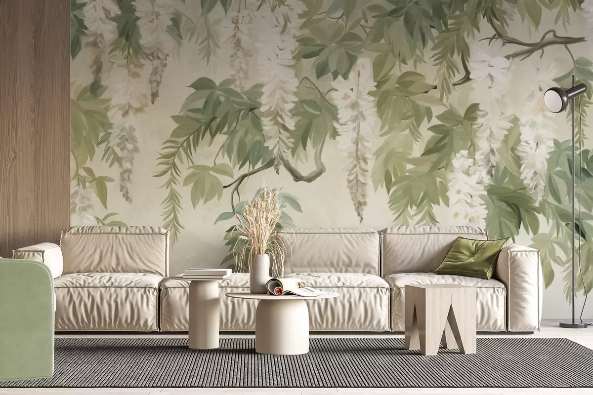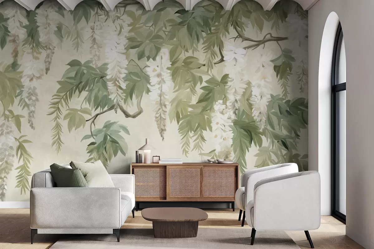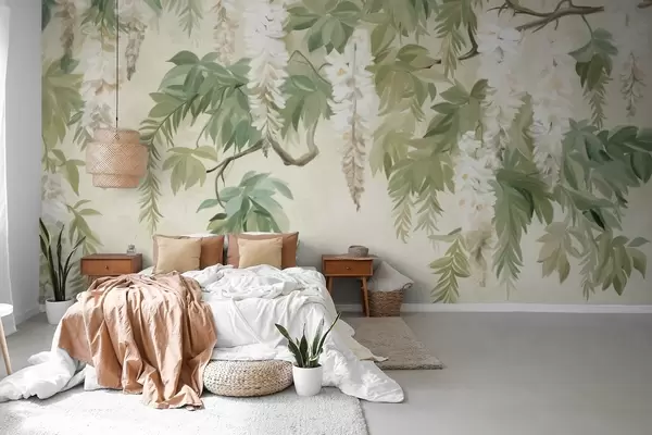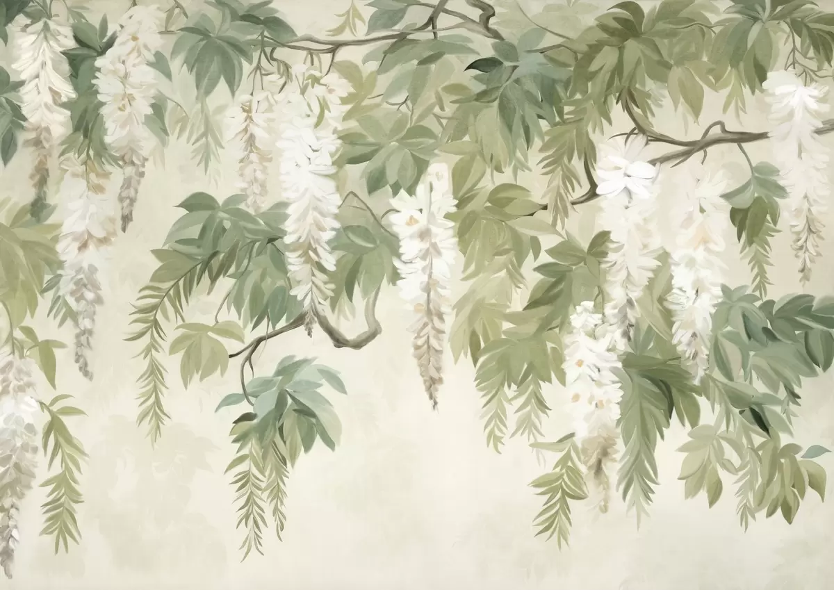 Fototapet Blåregn med vita blommor och gröna blad, grön bakgrund, texturerad vintage målningsstil Nr. w09375