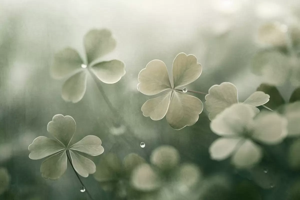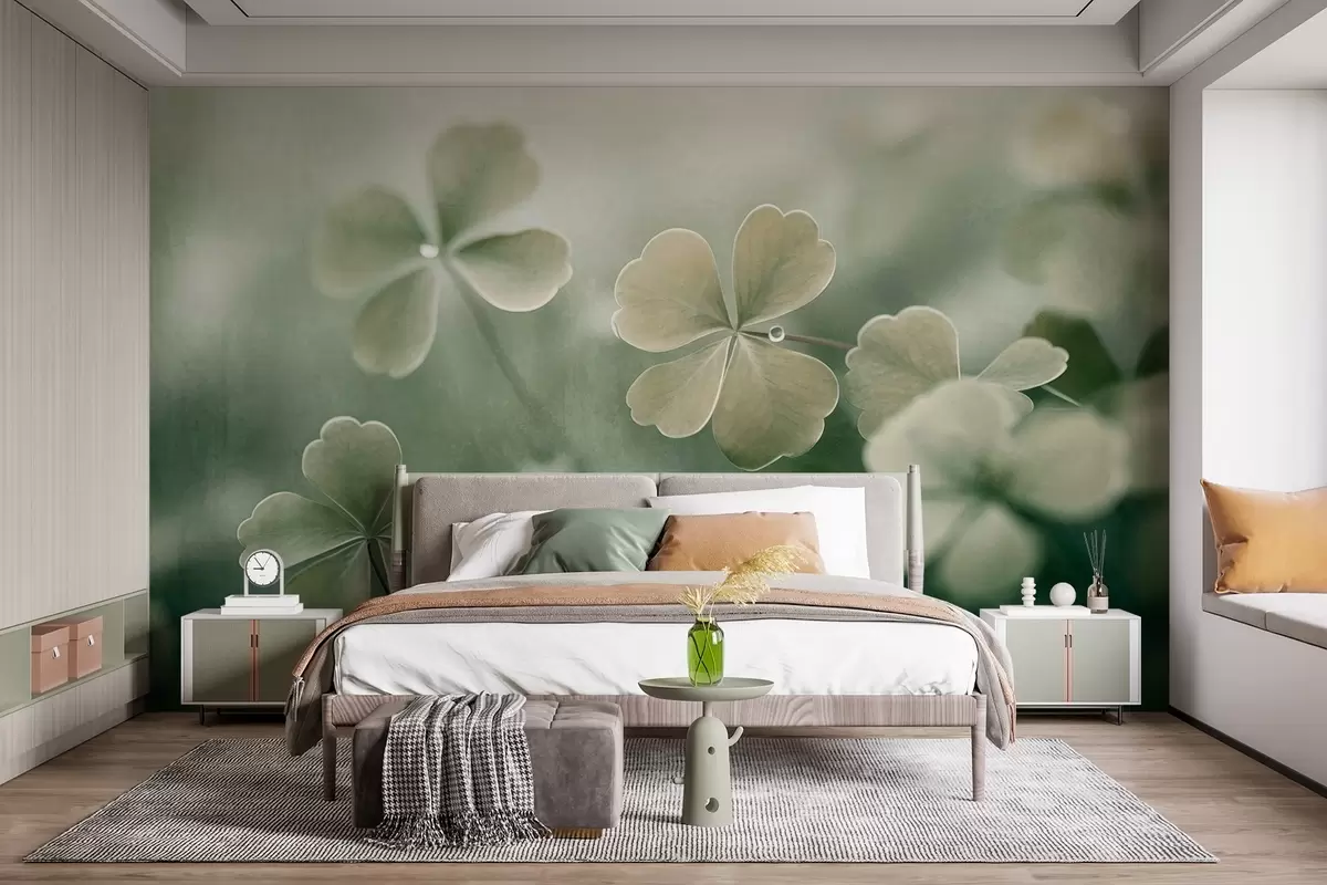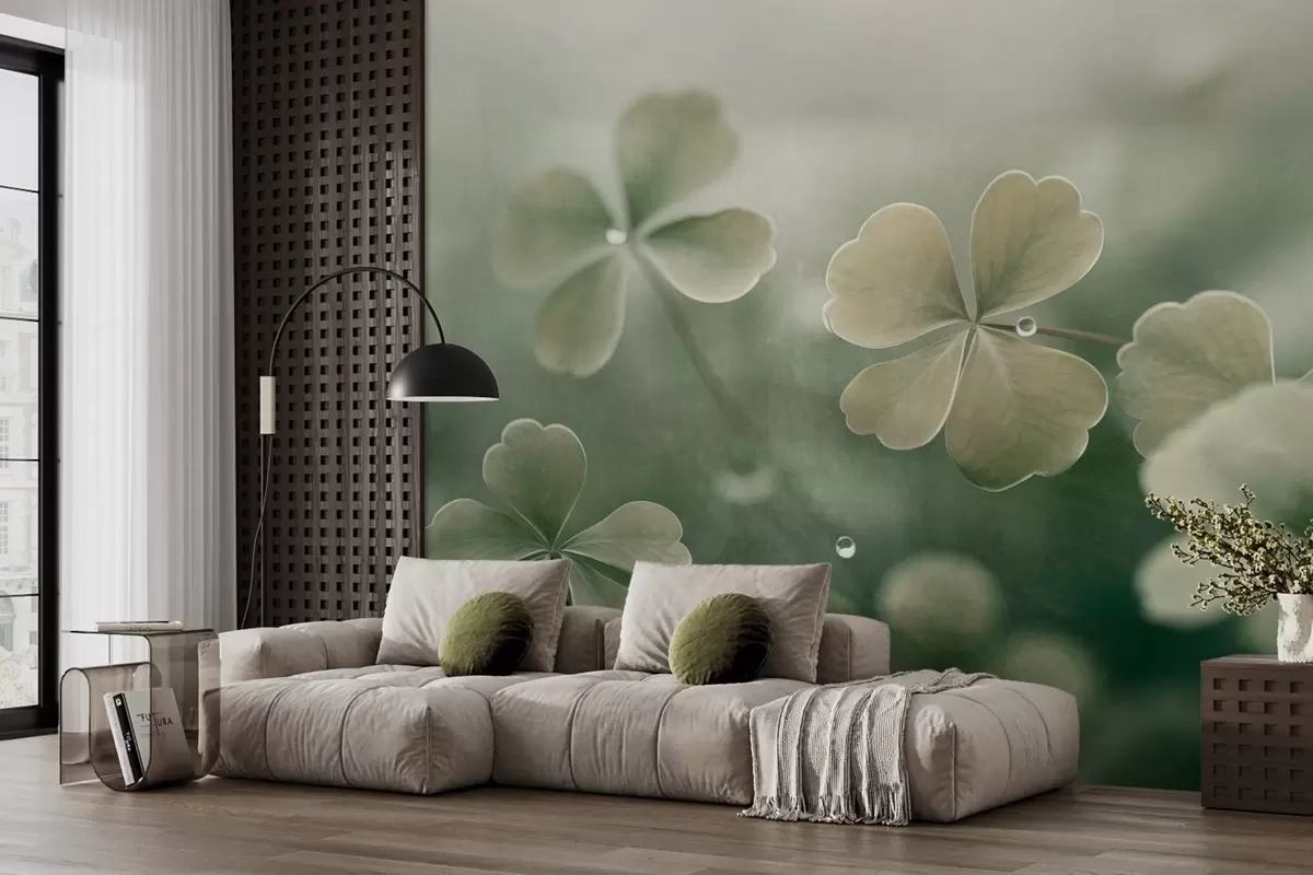 Fototapet Fyrklöver med vattendroppar, ljusgrön färg, mjuk fokus, oskarp bakgrund, strukturerat tryck Nr. w09376