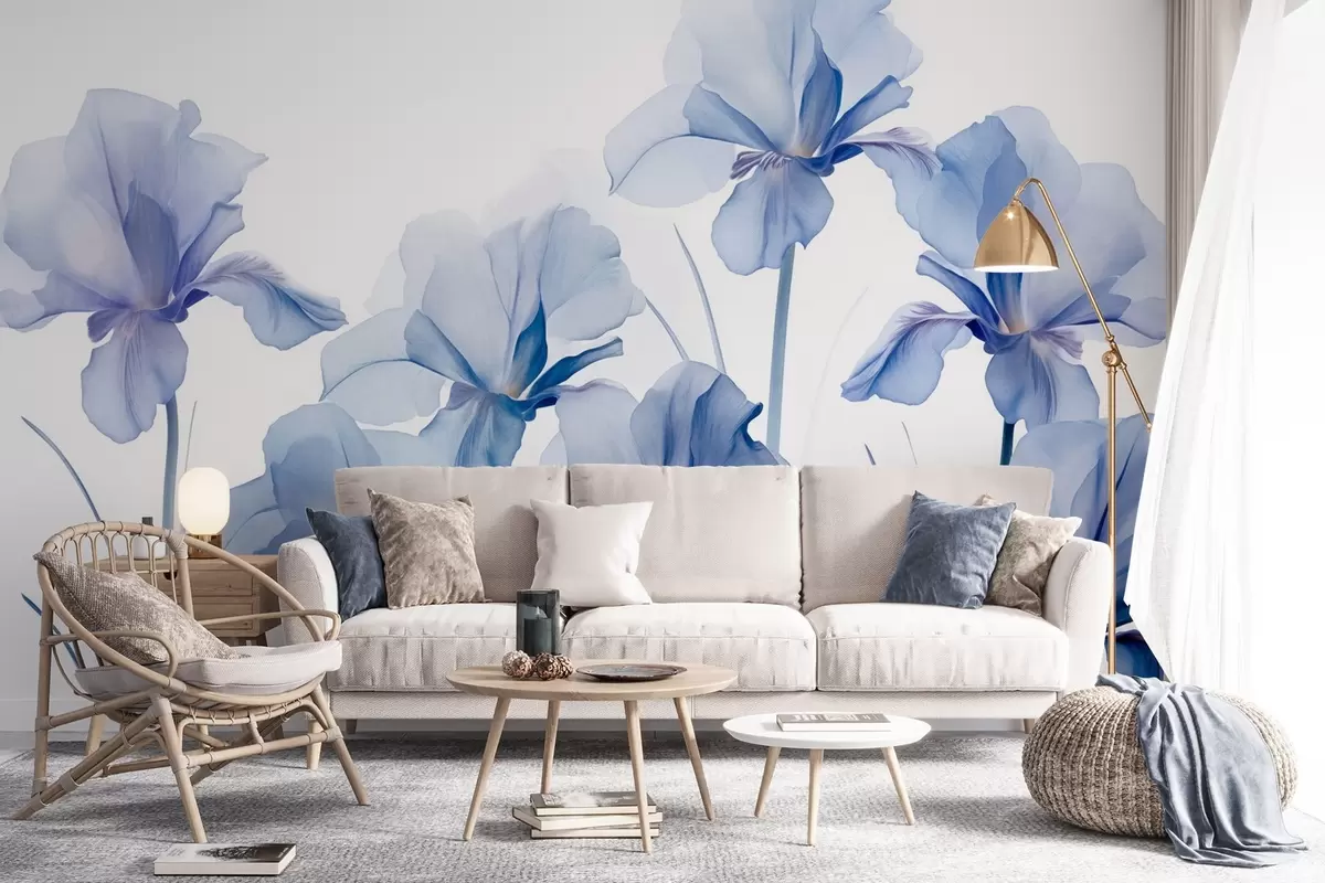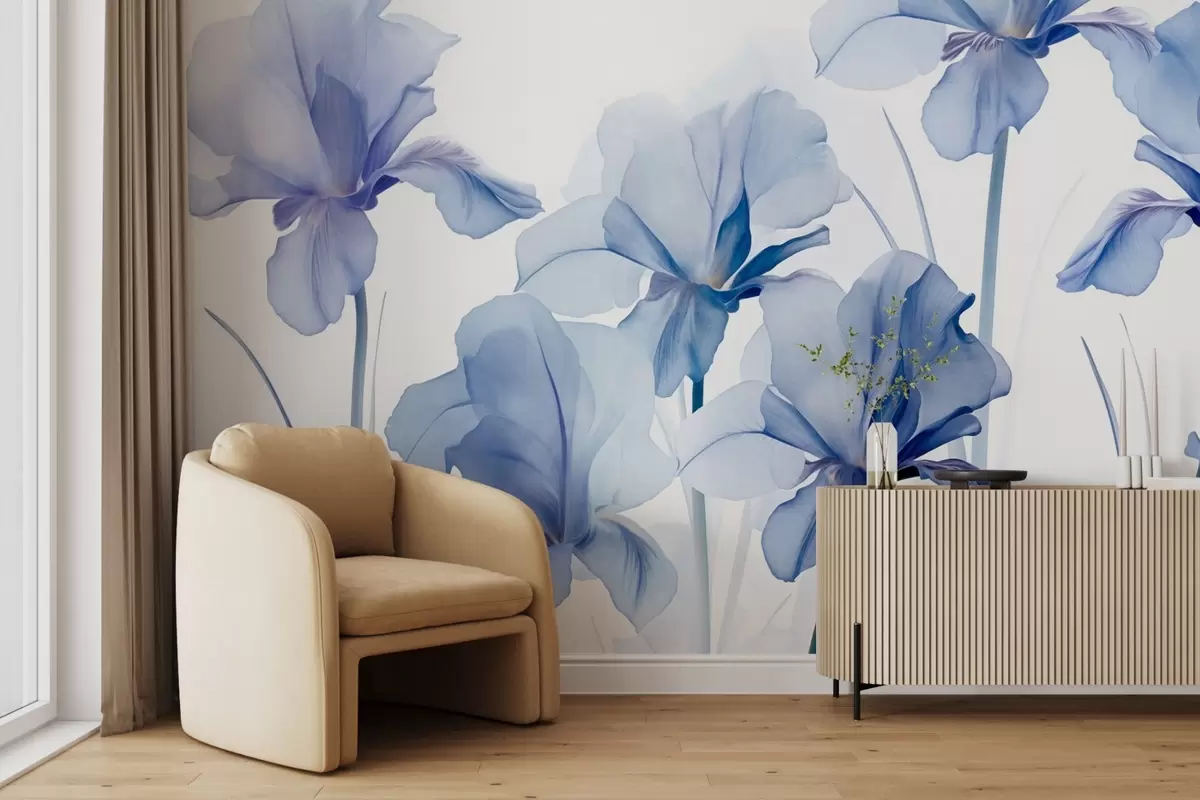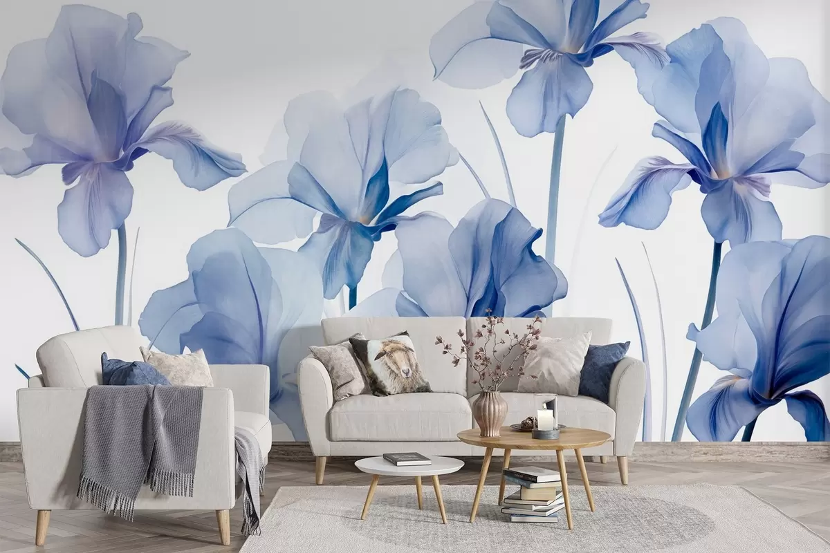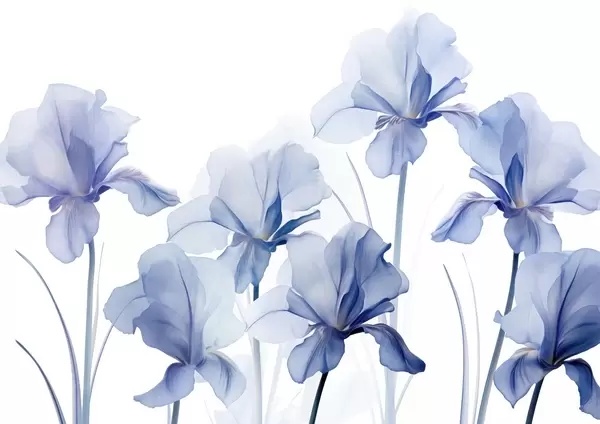 Fototapet Blå irisblommor med genomskinliga kronblad och långa stjälkar, arrangerade i en rad mot en blå bakgrund, mjuk och strukturerad Nr. w09379