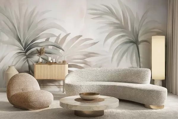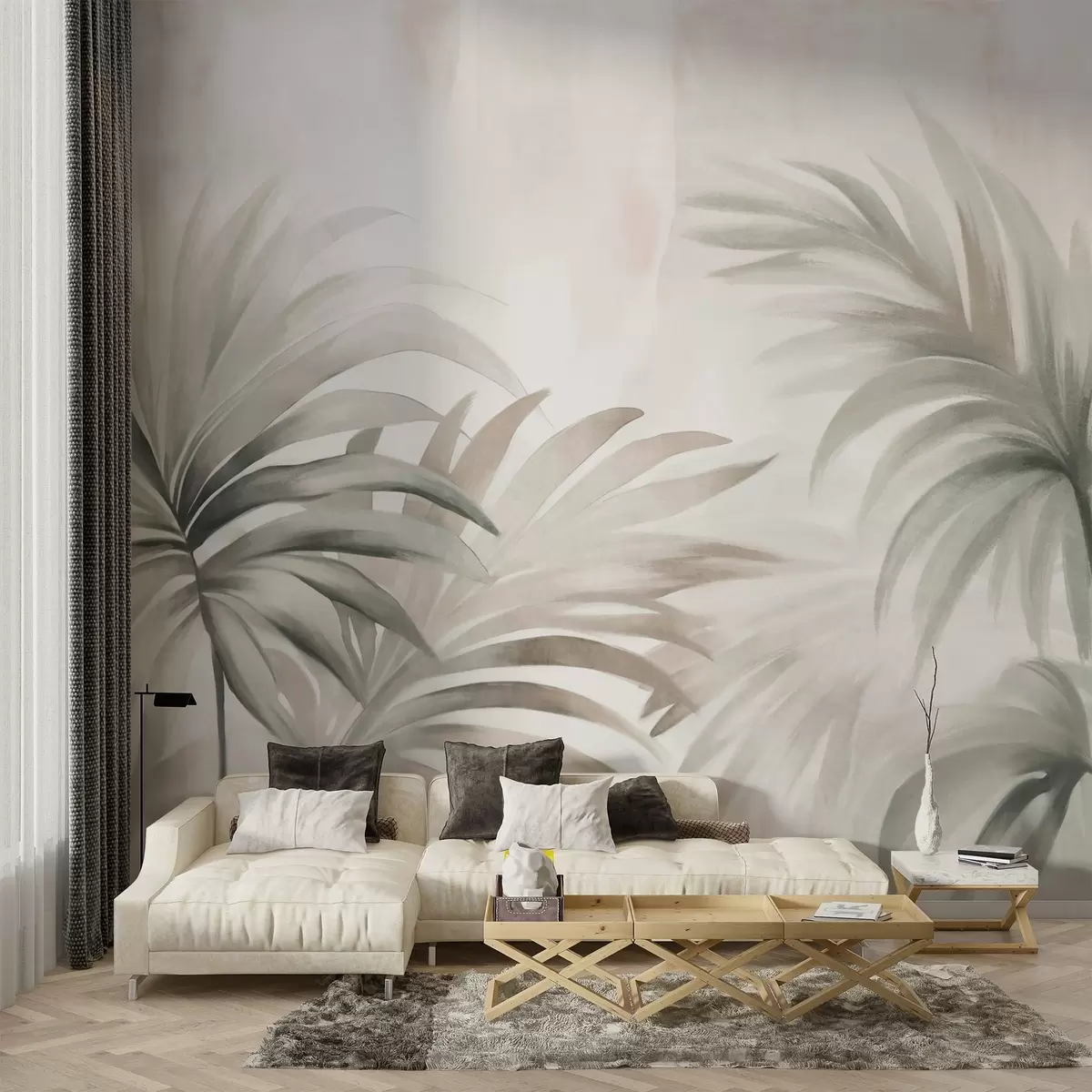 Fototapet Palmträd med texturerade blad i neutrala färger, beige abstrakt bakgrund, mjuka penseldrag, tropiskt texturerat lövverk Nr. w09380