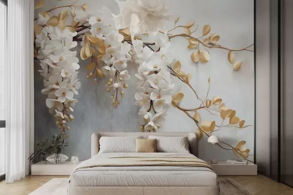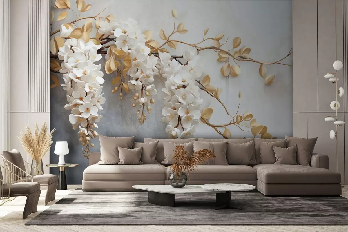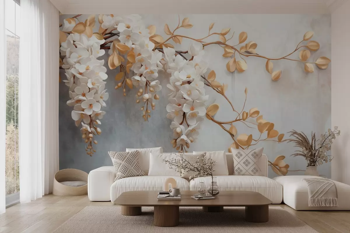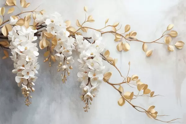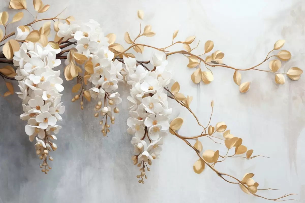 Fototapet Vita blåregnblommor med gula blad på en gren, faller ner mot en strukturerad vit bakgrund, fina kronblad Nr. w09381