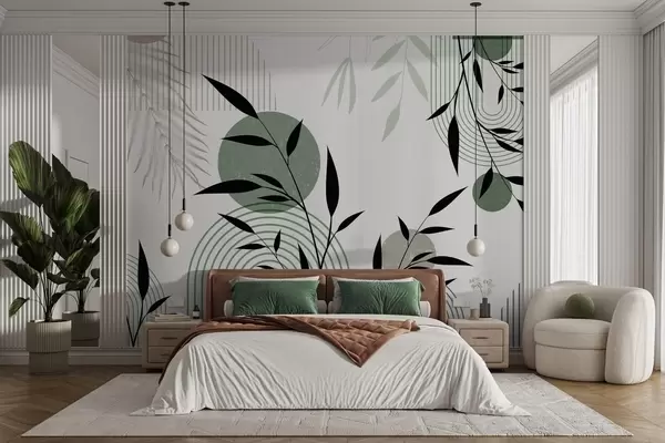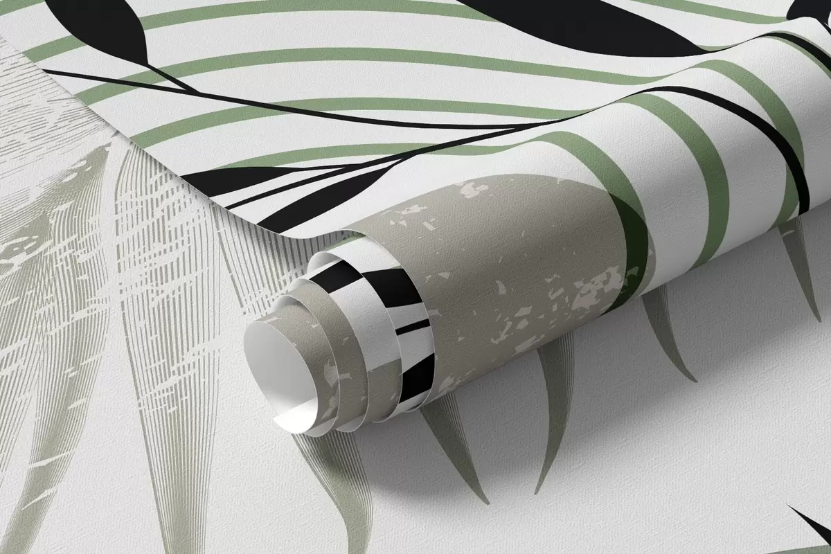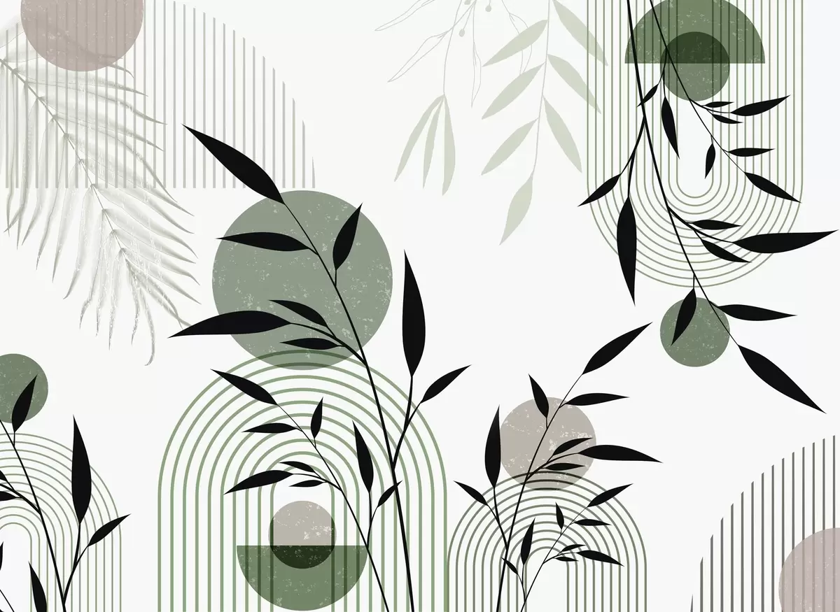 Fototapet Texturerat abstrakt tryck med geometriska former, cirklar och bågar samt svarta och gröna växter på en vit bakgrund Nr. w09384