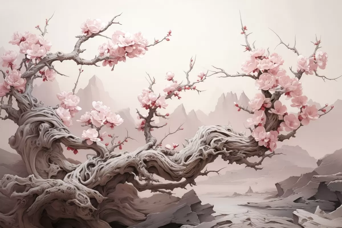 Fototapet Tvinnade trädstammar med blommande rosa sakura Nr. w09388