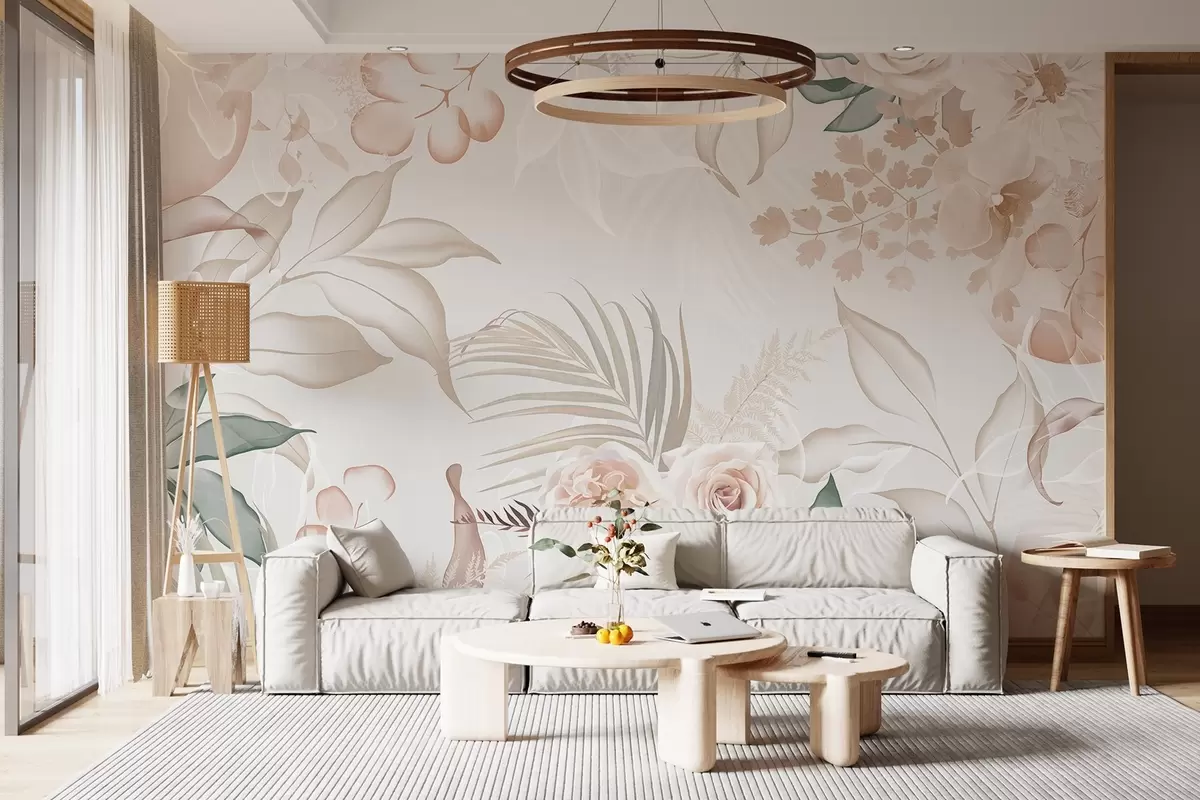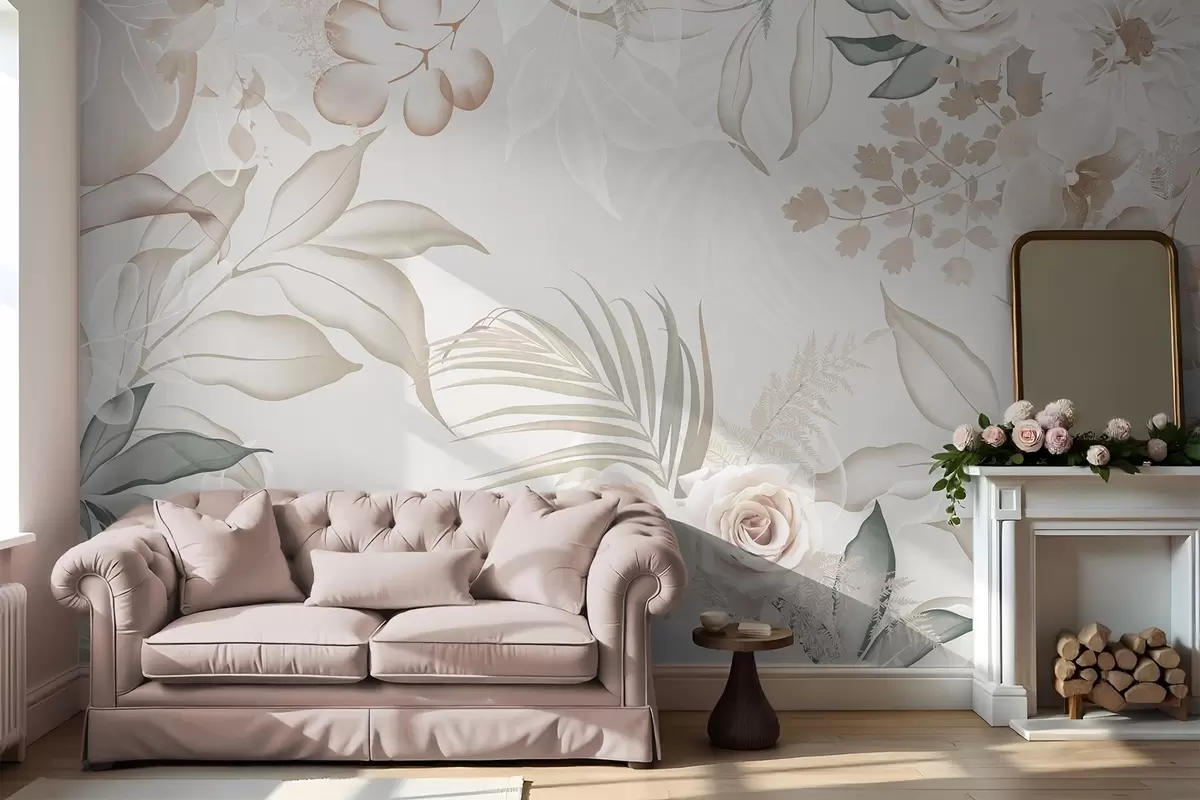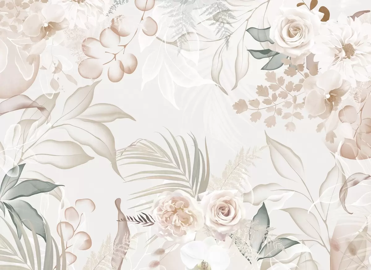 Fototapet Blommigt arrangemang med rosor, orkidéer, eukalyptus och palmblad i pastellfärger, beige bakgrund Nr. w09393