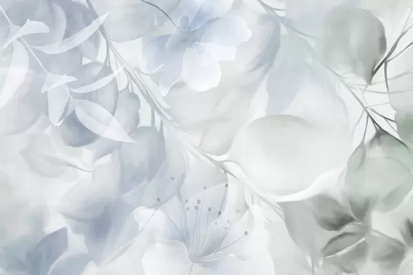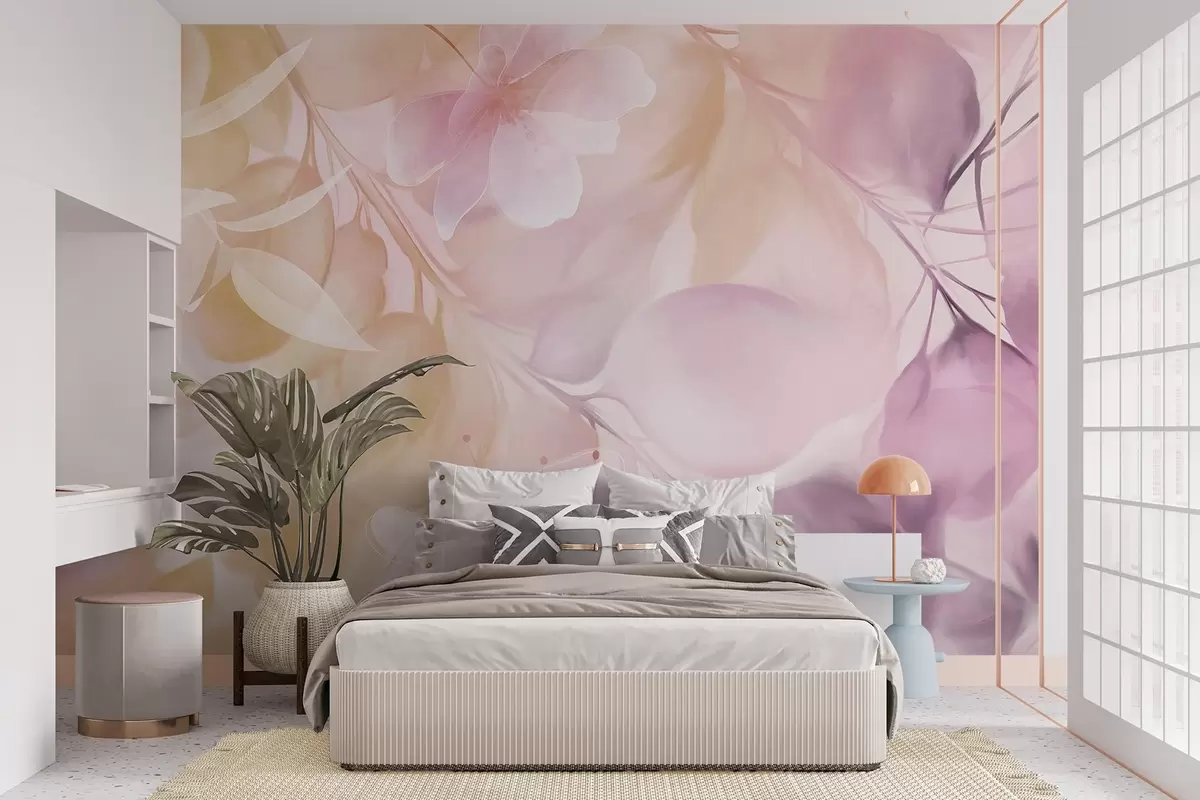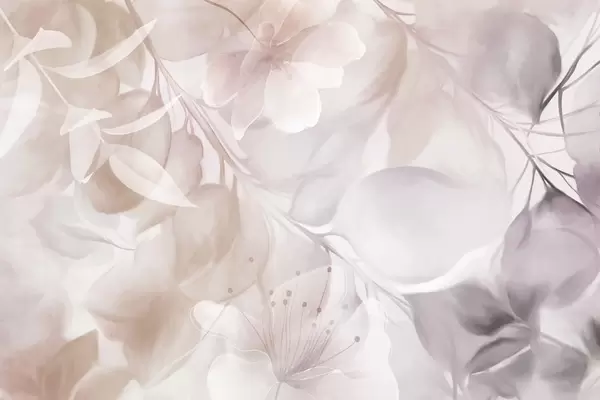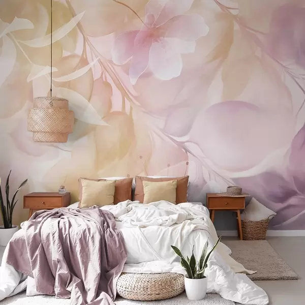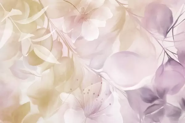 Fototapet Blomsterkonst med dämpade gula och lila blommor, blad och grenar, mjuka pastellfärger, akvarellstruktur Nr. w09397v2