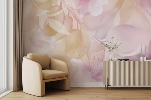 Fototapet Blomsterkonst med dämpade gula och lila blommor, blad och grenar, mjuka pastellfärger, akvarellstruktur Nr. w09397v2