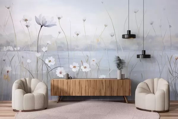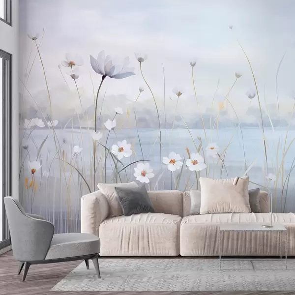 Fototapet Vita blommor med långa stjälkar på ett fält, ljusblå himmel, mjuka färger, texturerad, minimalistisk stil, naturinspirerad, lugn bakgrund Nr. w09401