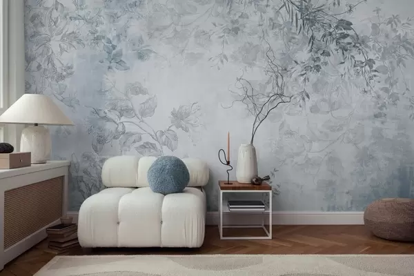 Fototapet Vintage texturerad blomsterkonst med illustrationer av delikata trädgårdsblommor och blad i teckningsstil, mjuka blå toner Nr. w09402v1
