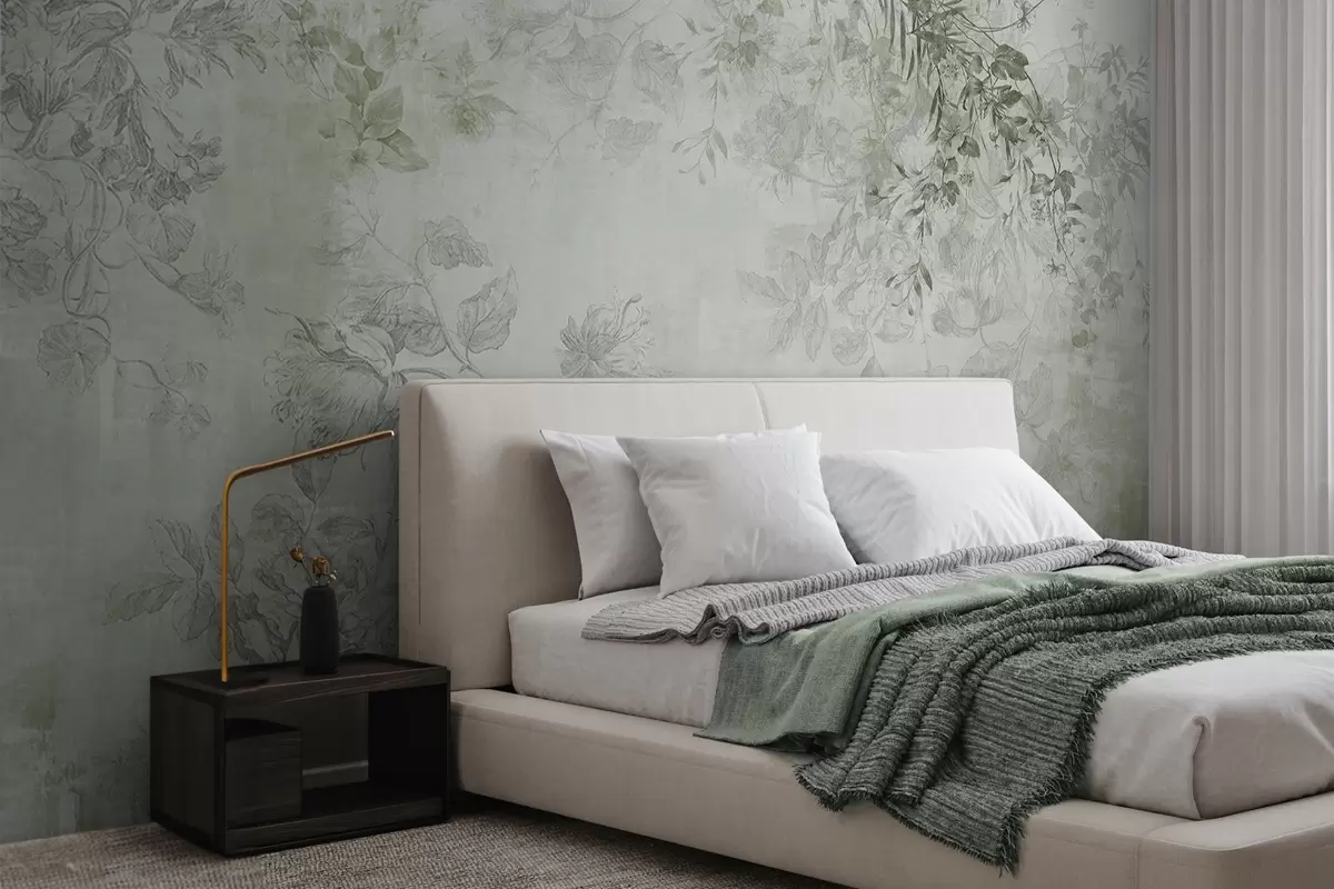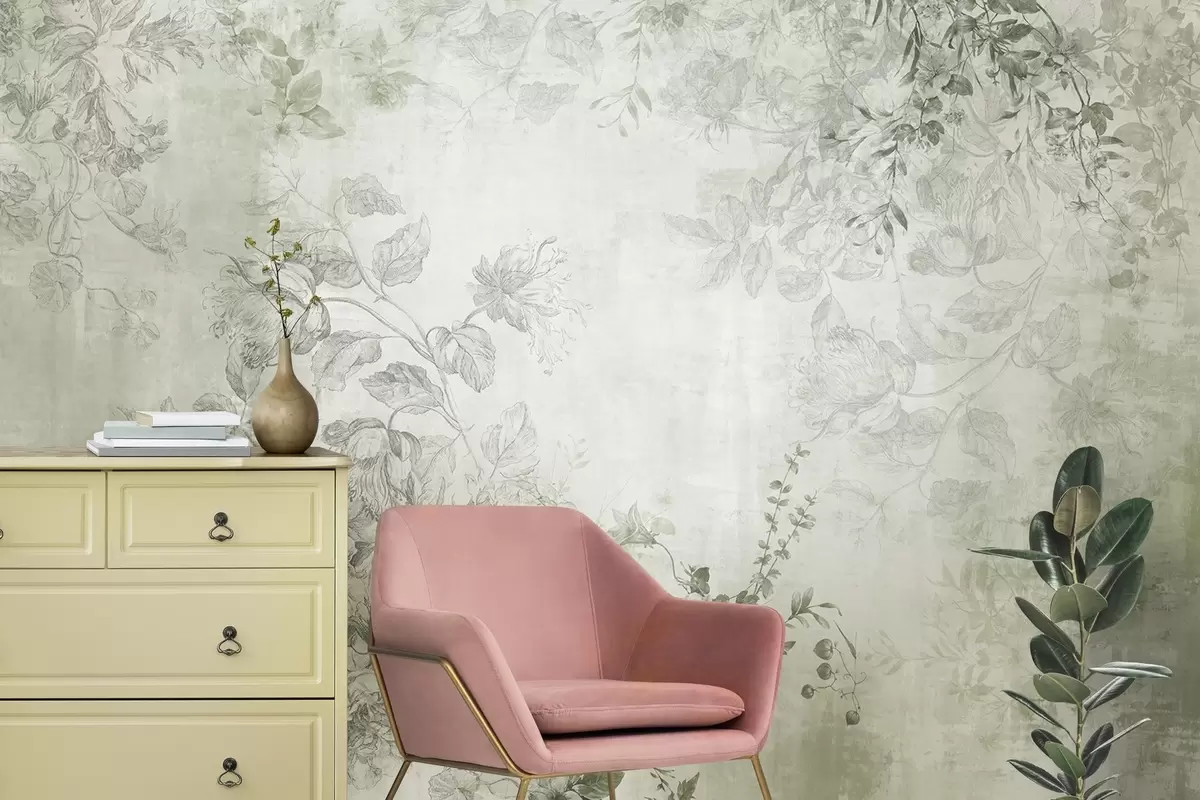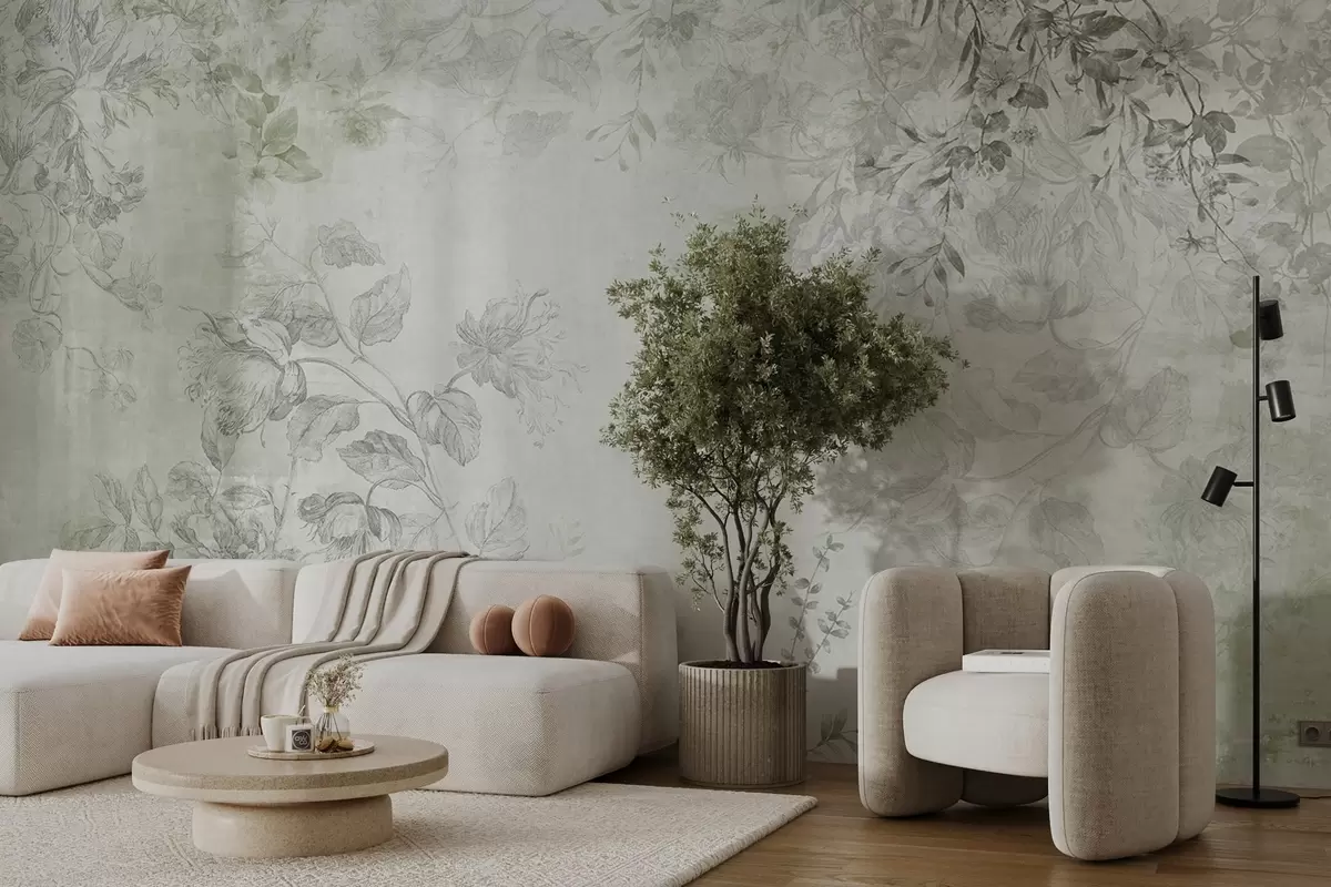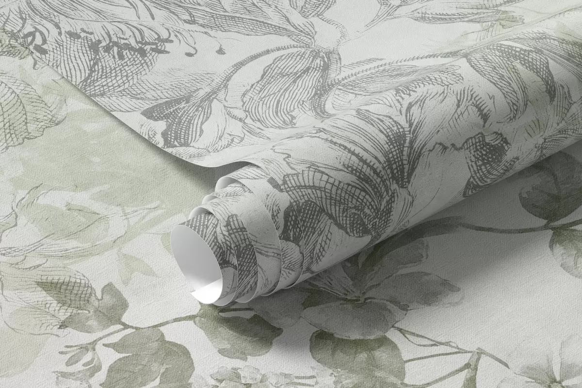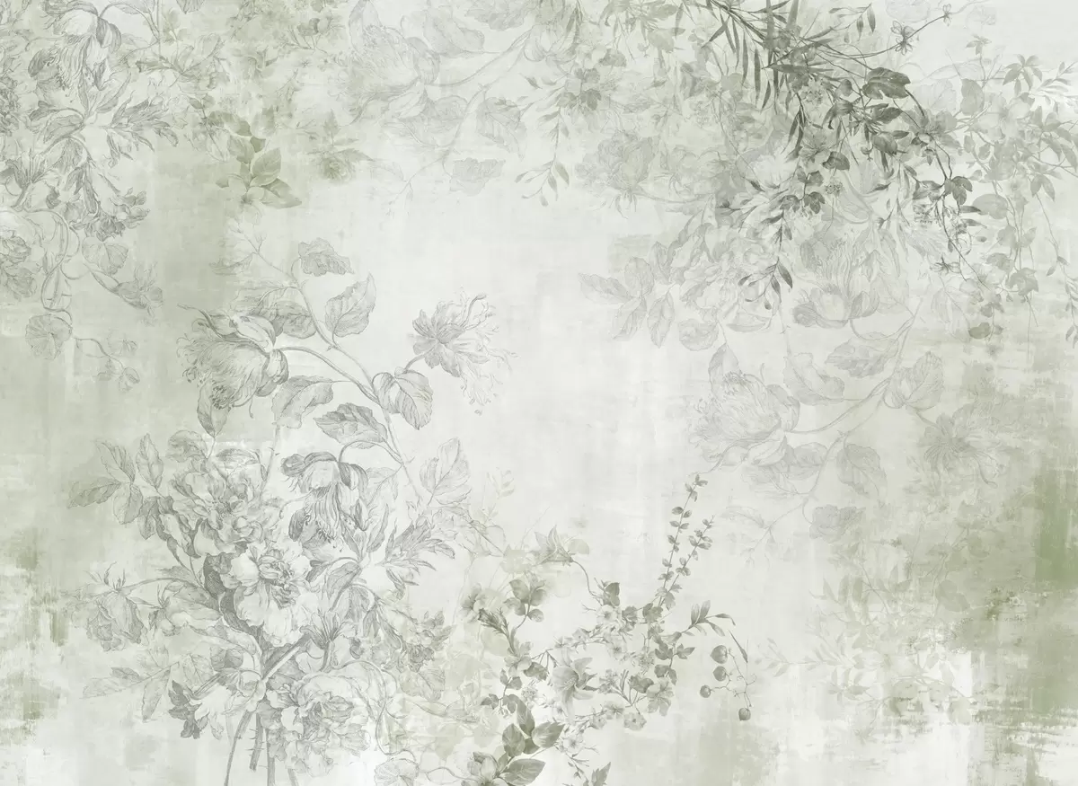 Fototapet Vintage texturerad blomsterkonst med illustrationer av delikata trädgårdsblommor och blad i teckningsstil, mjuka gröna toner Nr. w09402v2