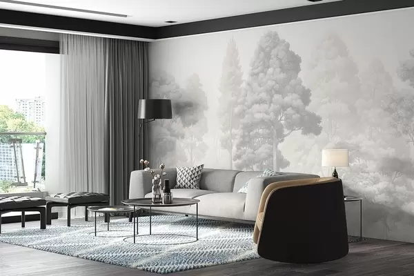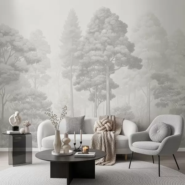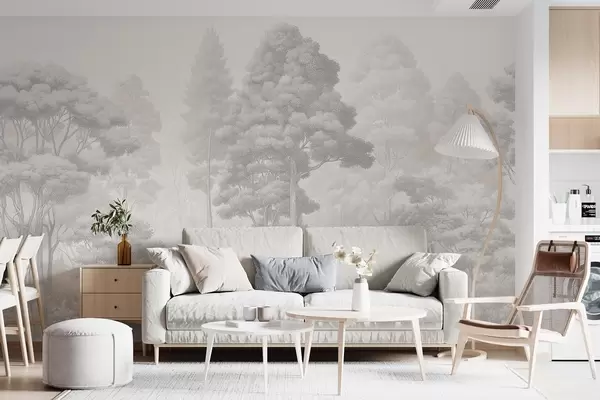 Fototapet Konstnärligt skogslandskap i tekniken svartvit grafisk skraffering Nr. w09411