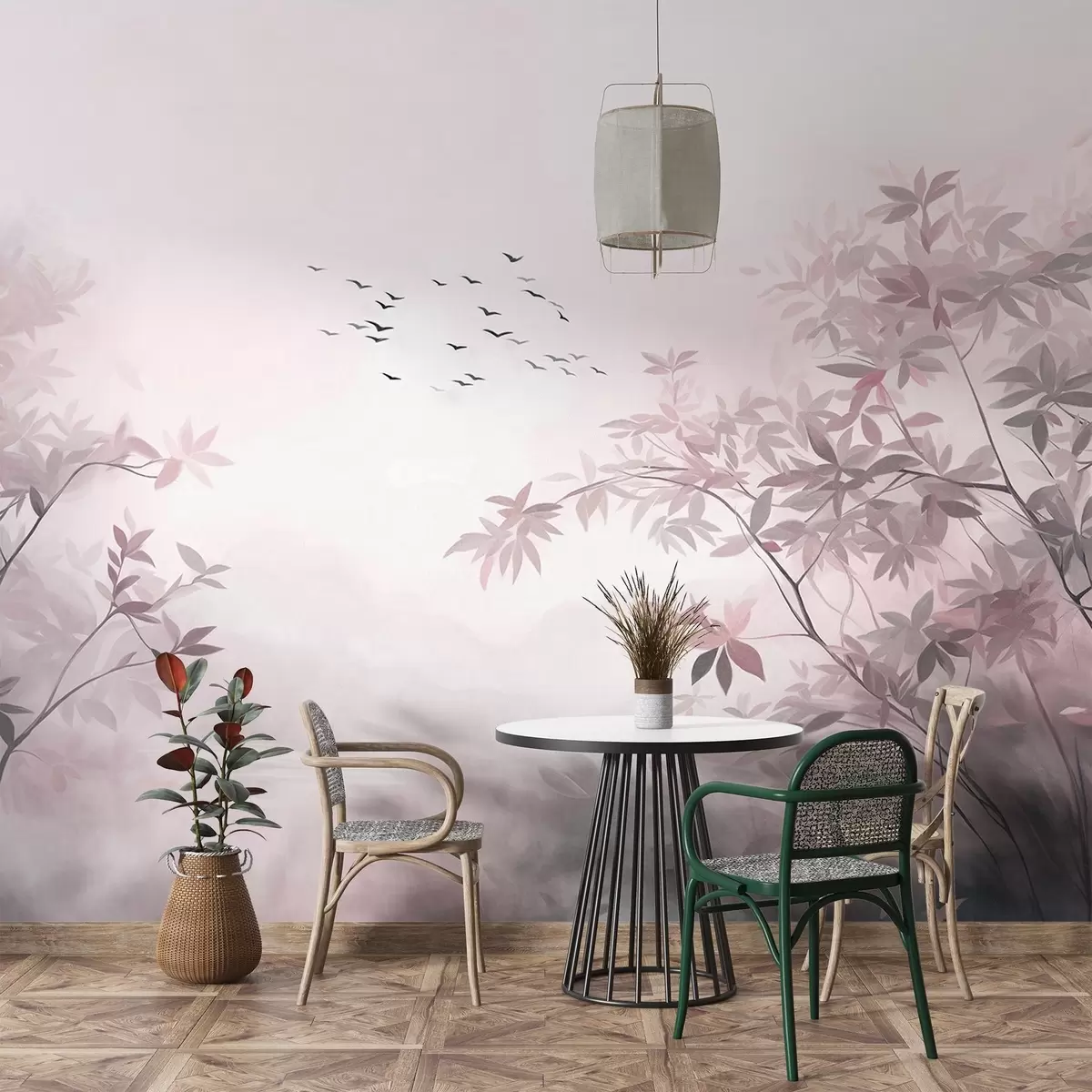 Fototapet Strukturerat landskap med träd och en flock fåglar som flyger i skyn, pastellfärger, naturmotiv Nr. w09418v1