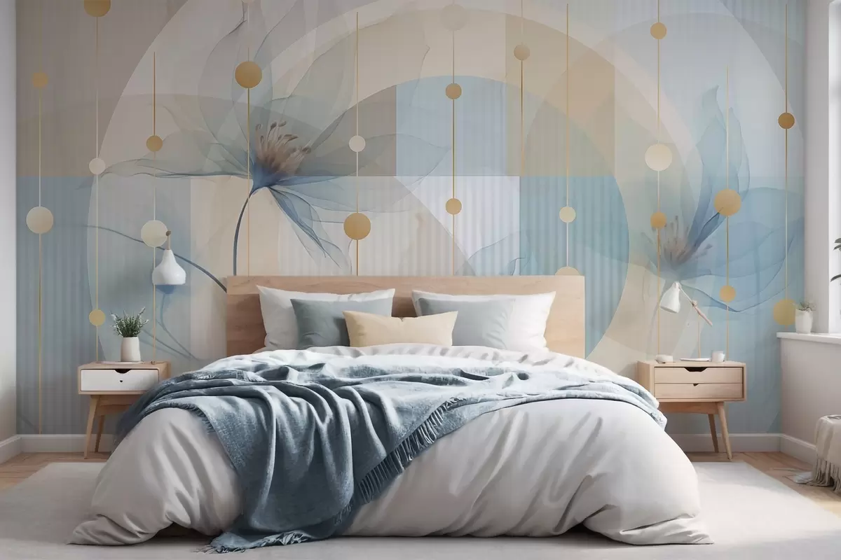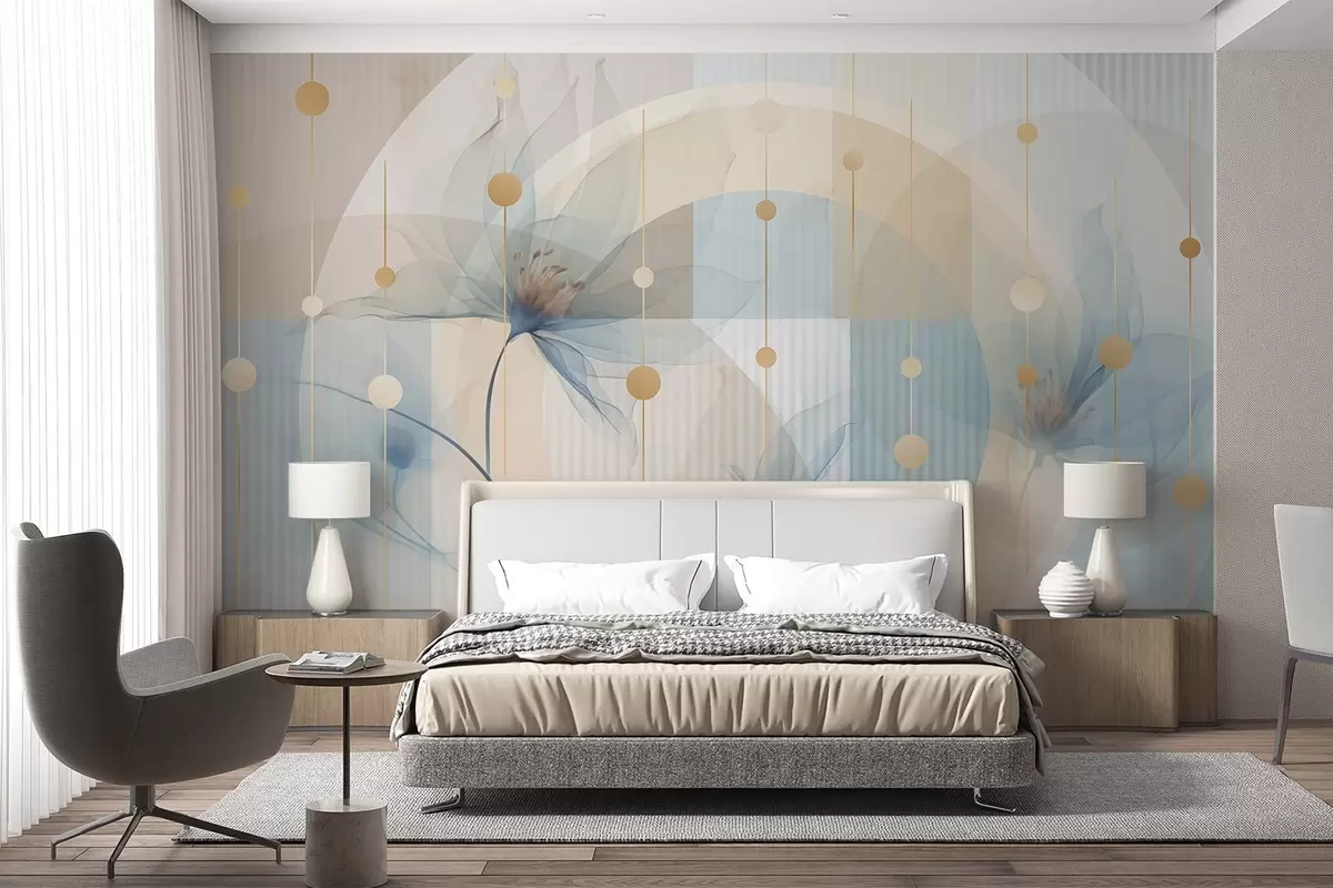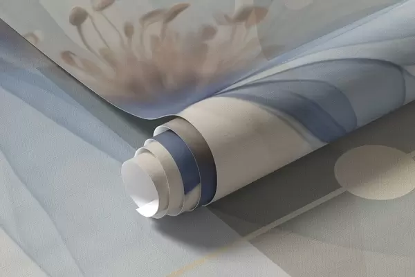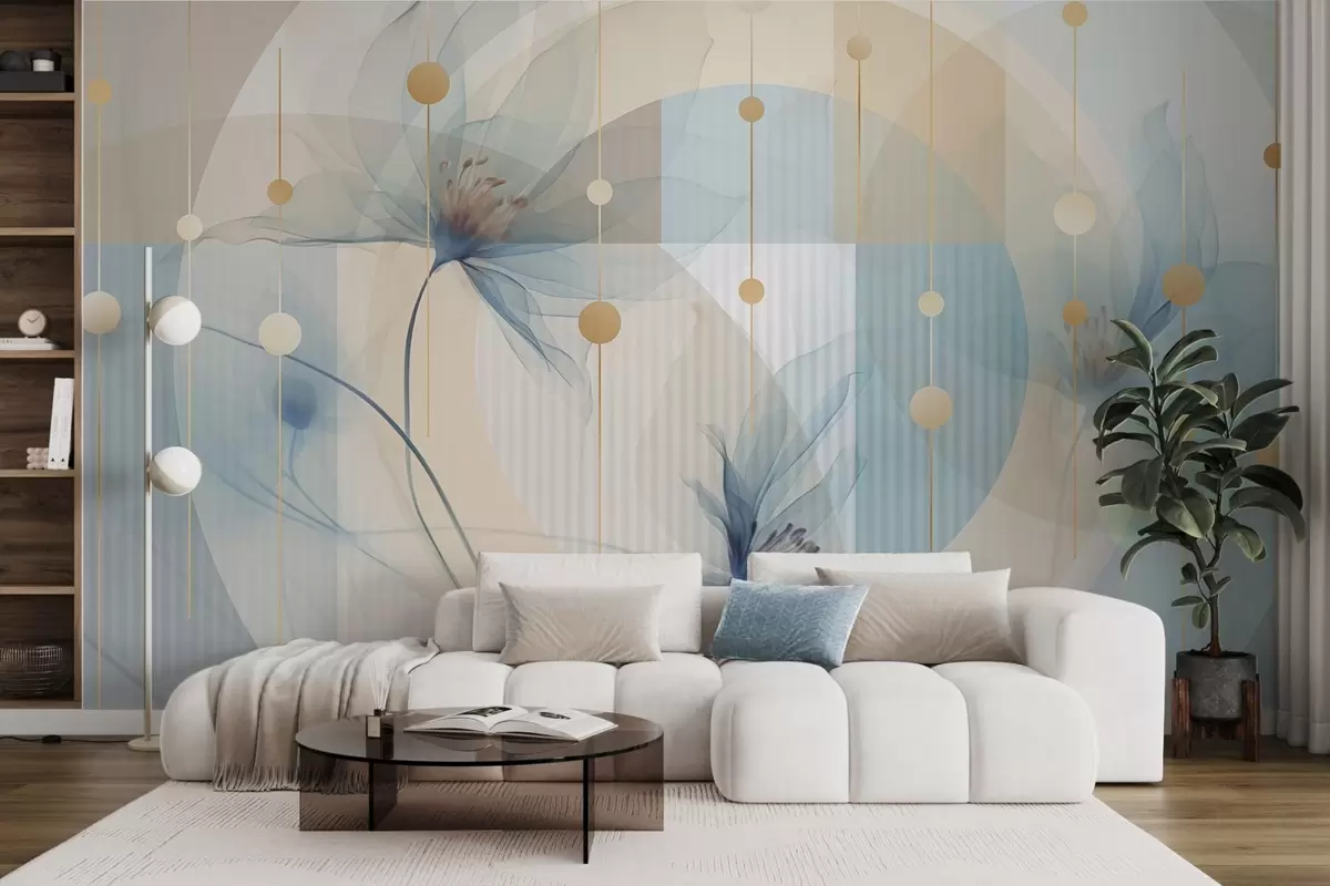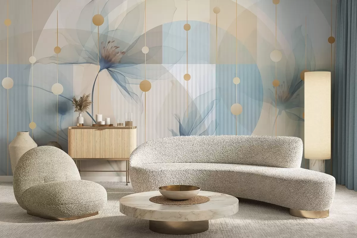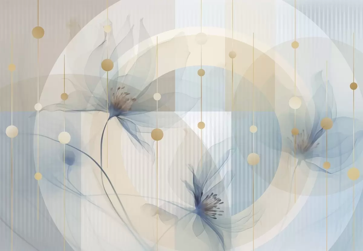 Fototapet Abstrakta genomskinliga blommor, cirklar och geometriska former, pastellblå, beige och vit färgpalett Nr. w09419