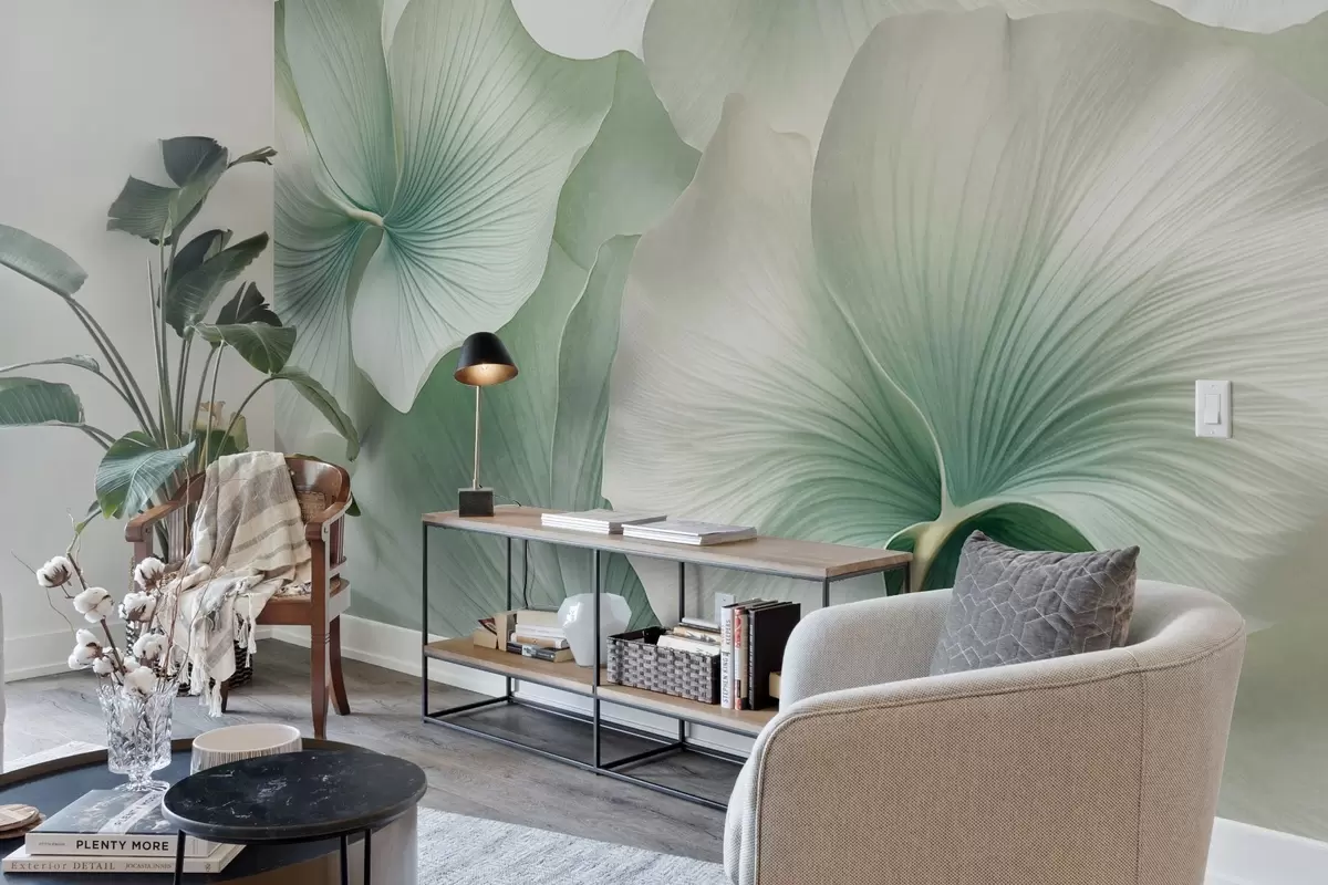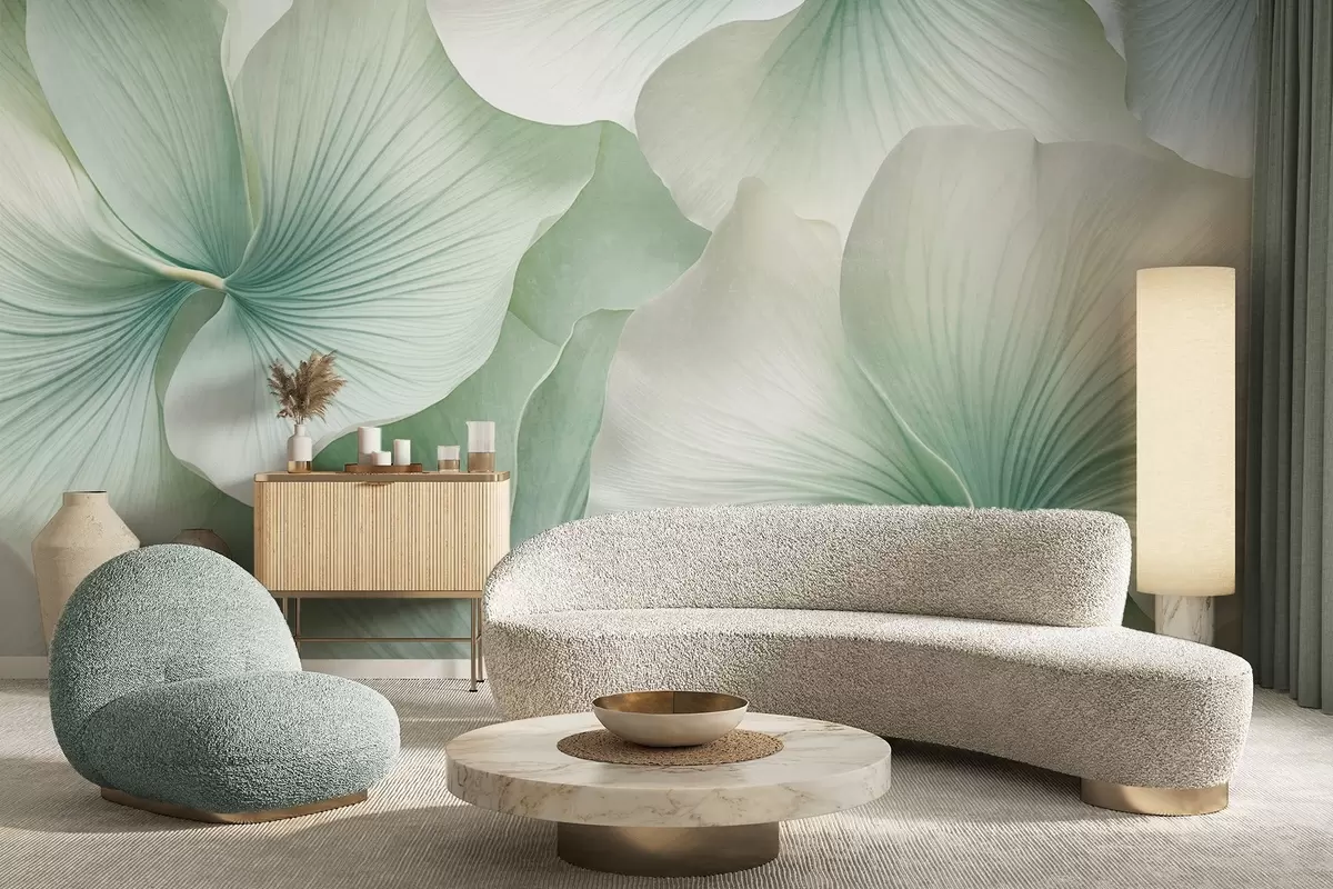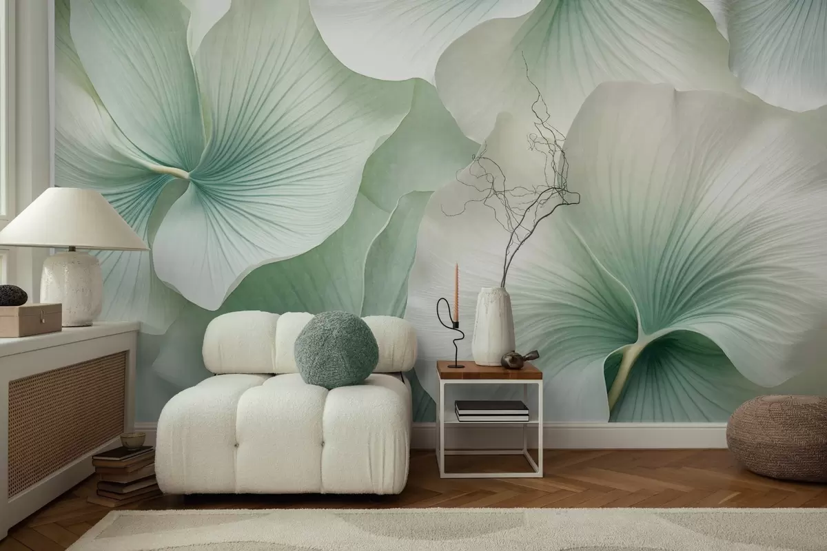Fototapet Vita och gröna ginkgoblad, mjuk struktur, abstrakt blommig bakgrund, minimalistisk modern stil Nr. w09421
